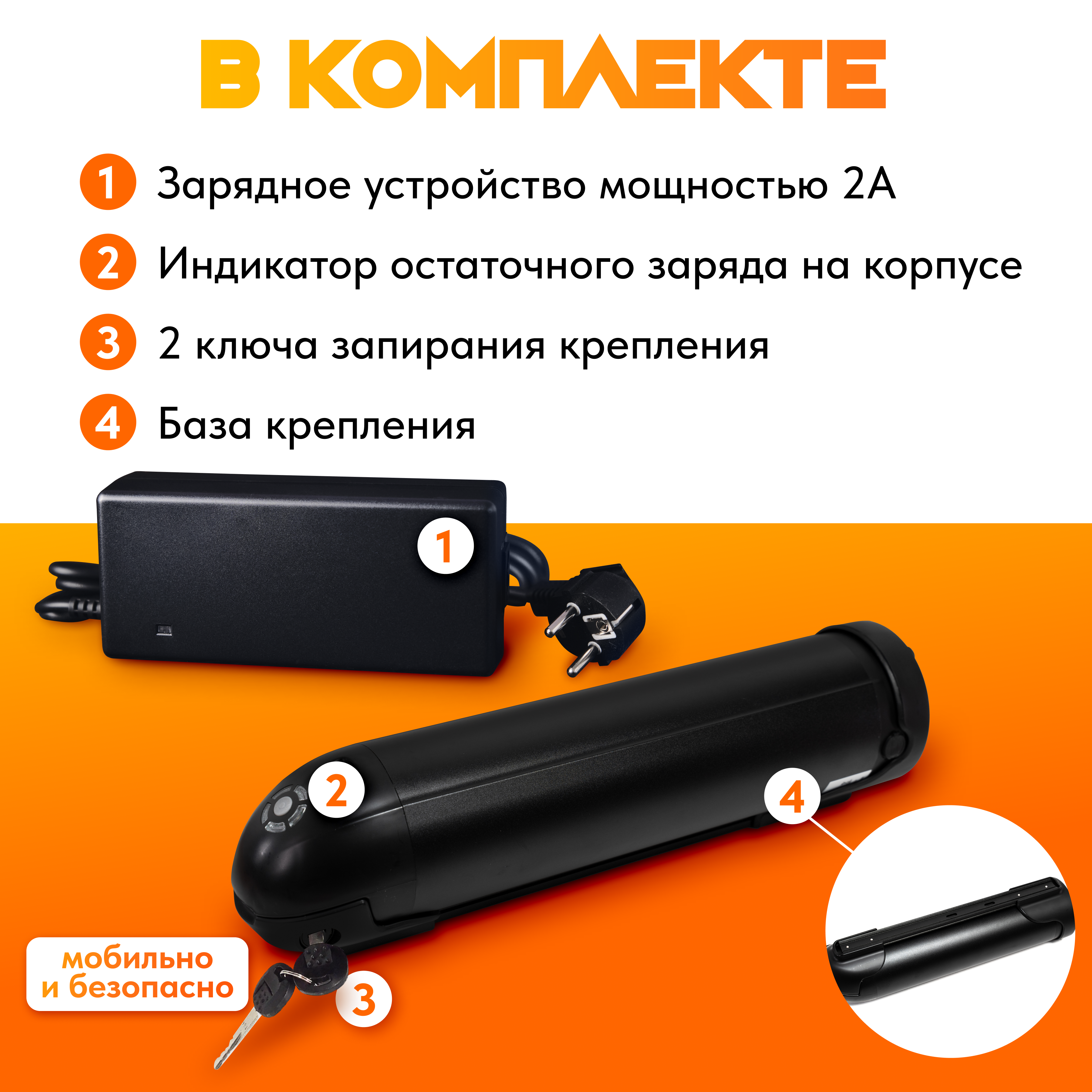 Аккумулятор в виде черной бутылки на раме, который легко снимается и одевается с помощью специального крепления. Чтобы зарядить батарею, не нужно нести весь велосипед к розетке - достаточно снять акб с рамы и подключить её к зарядному устройству, которое входит в комплект.