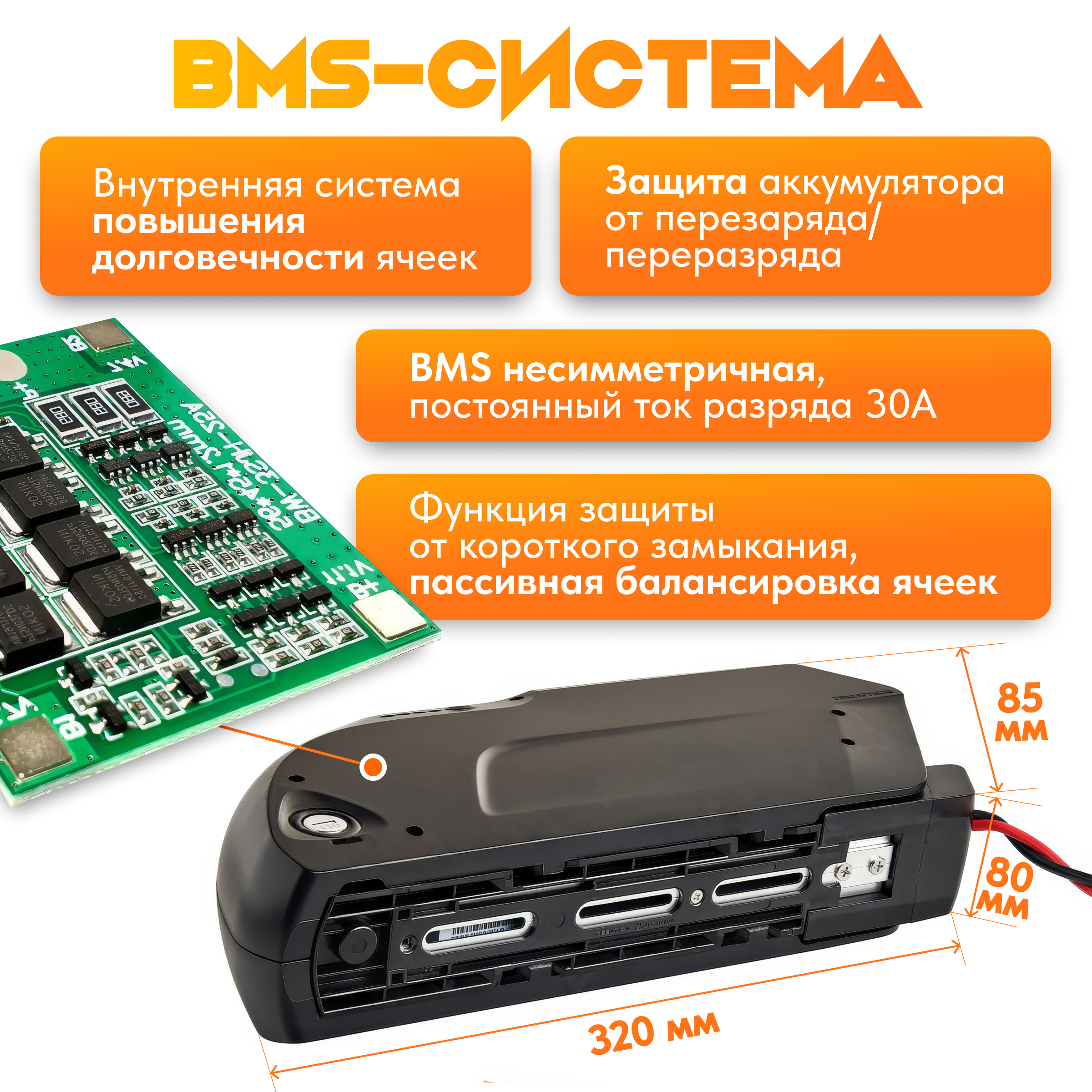 Своё название "Акула" (Shark) этот аккумулятор получил из-за своей формы. Пробега на одной зарядке хватит на 25-50 км в зависимости от холмистости и режима езды, а также от веса велосипеда. Внутри установлена плата BMS, которая поддерживает токи до 40А и позволяет использовать эту батарею с мотор-колесами до 2000 Вт включительно. Устанавливается аккумулятор на раму двумя болтами на места креплений фляги с водой.