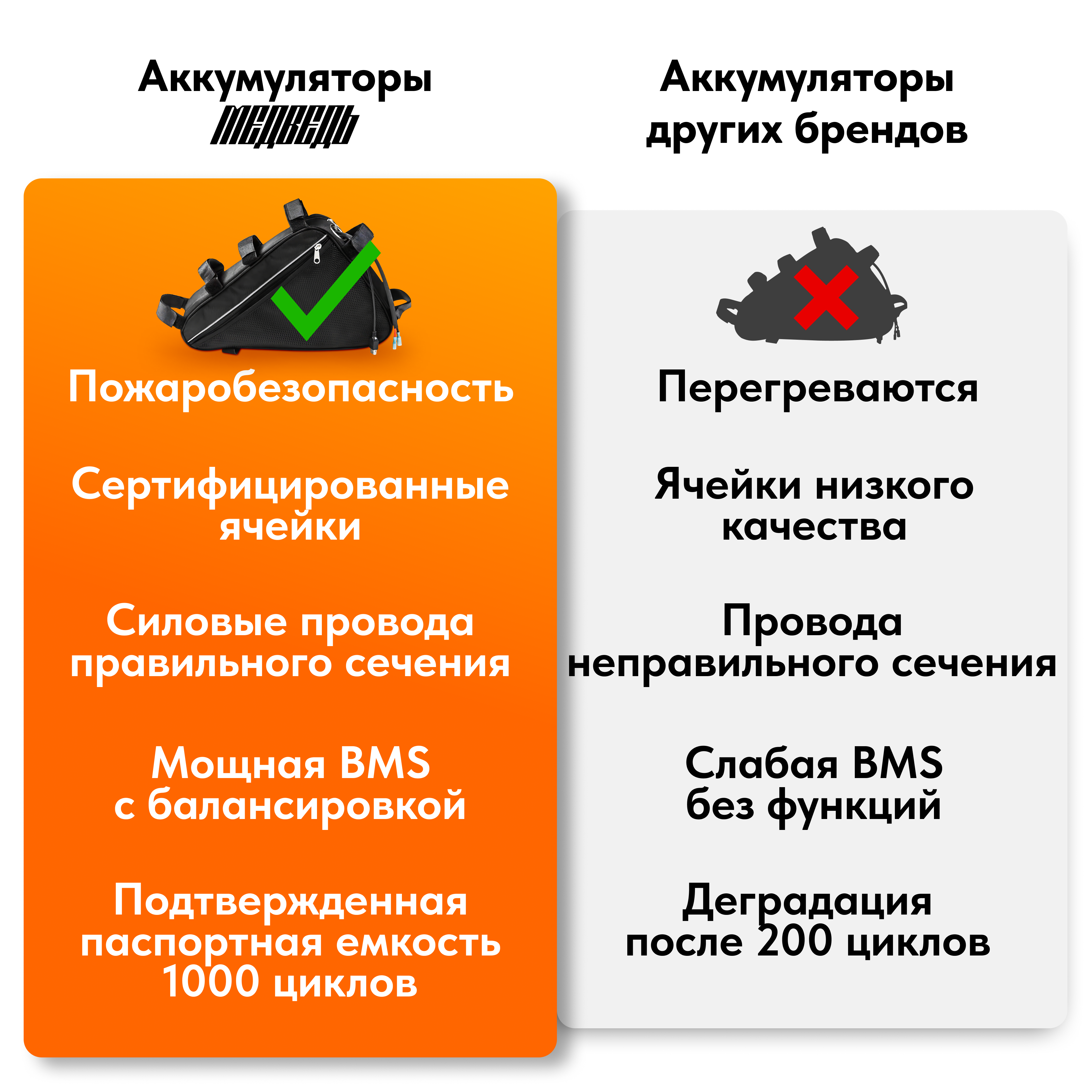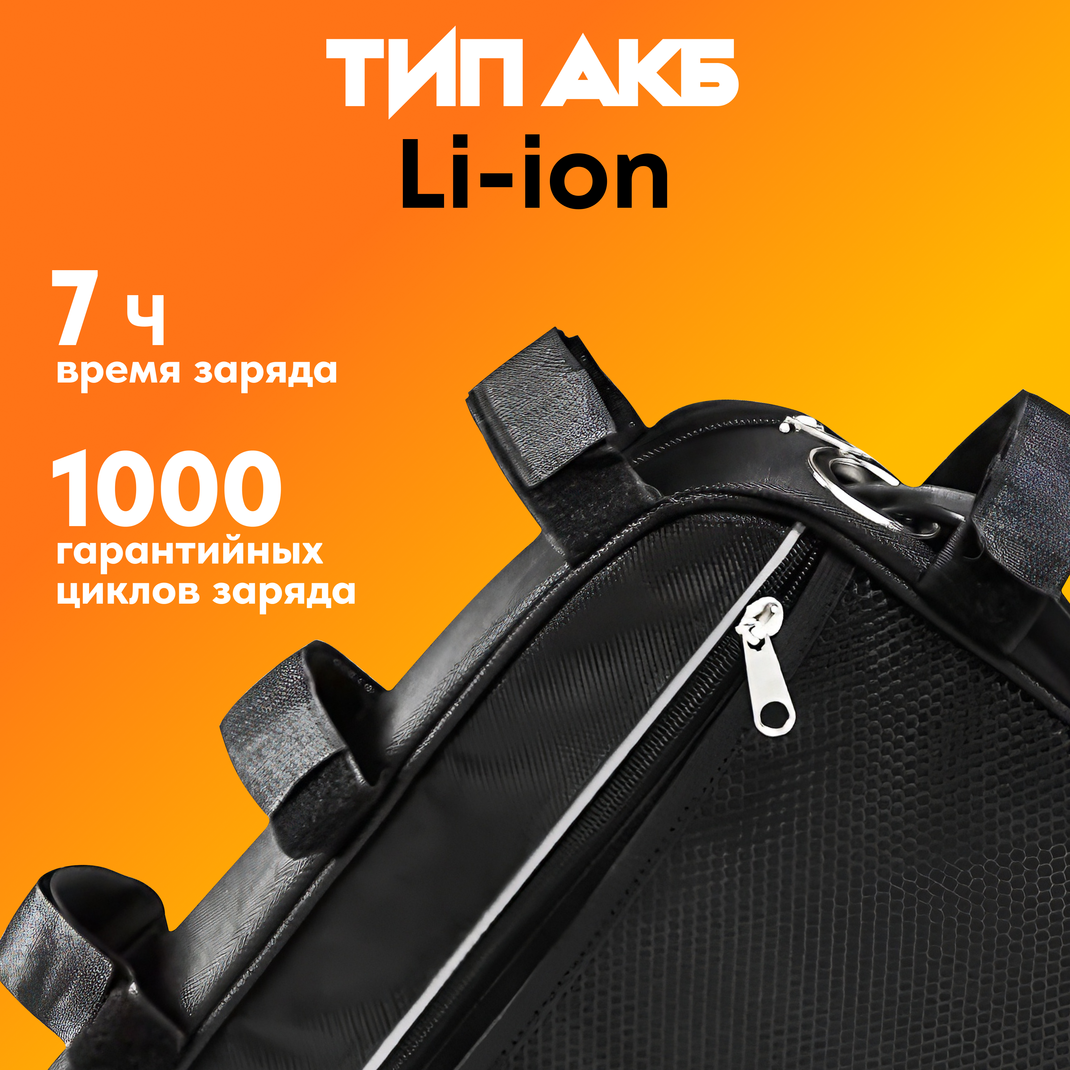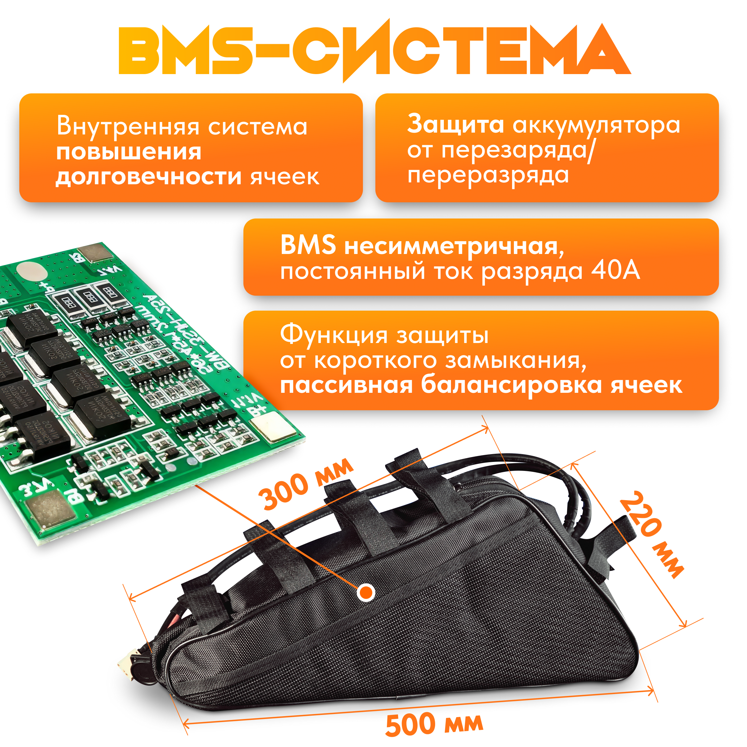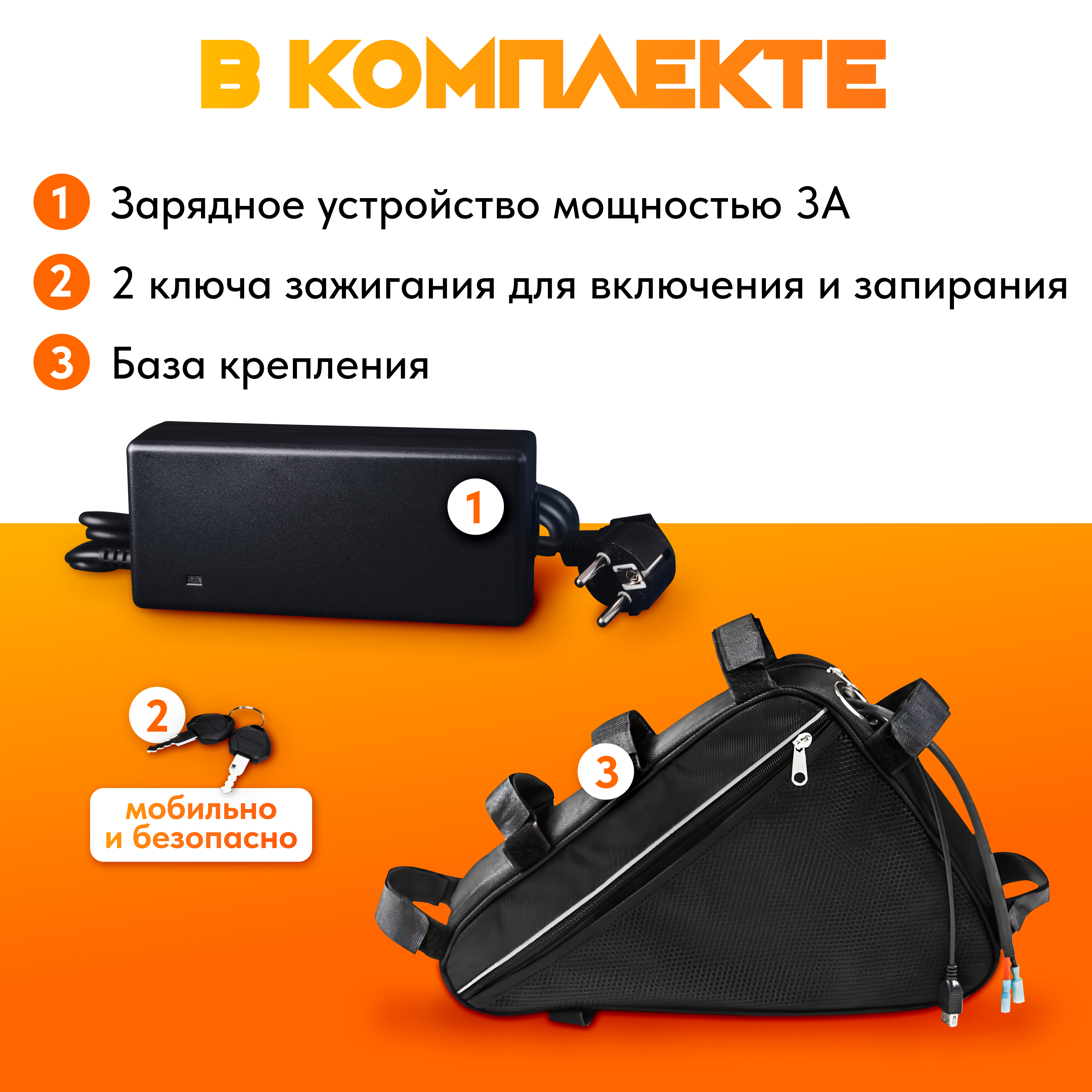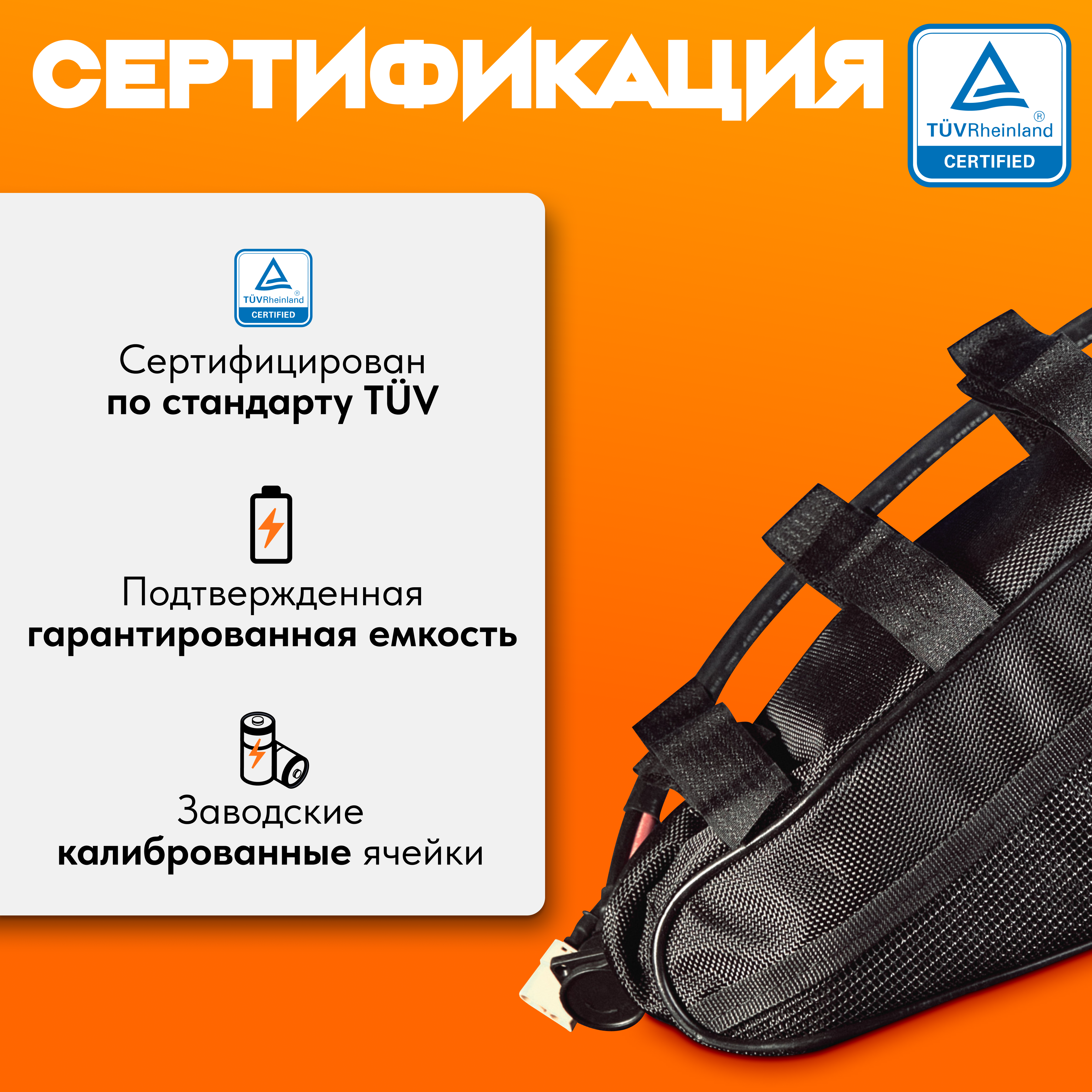 Эта ёмкая аккумуляторная батарея для электровелосипеда даст вам возможность проехать 40-80 км на одном заряде. Дальность пробега зависит от скорости езды, плавности трогания с места, веса велосипедиста и наличия подъемов на дистанции. Подходит для работы с моторами до 3000 Вт.