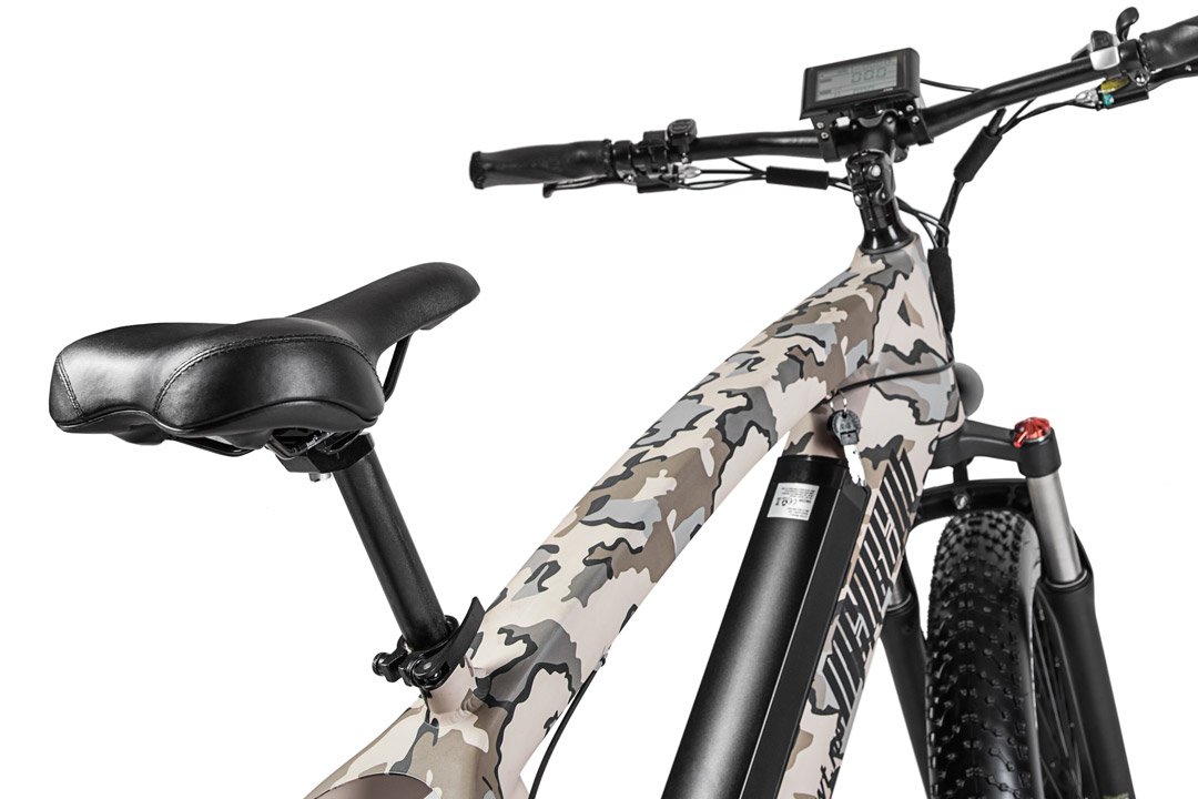 Установленный редукторный мотор на 750 Вт который обеспечивает высокую тягу и при этом экономичен. Развивает скорость более 35 км/ч. Оборудован гидравлическими тормозами от мирового производителя Tektro. Эффектная камуфляжная расцветка электровелосипеда.