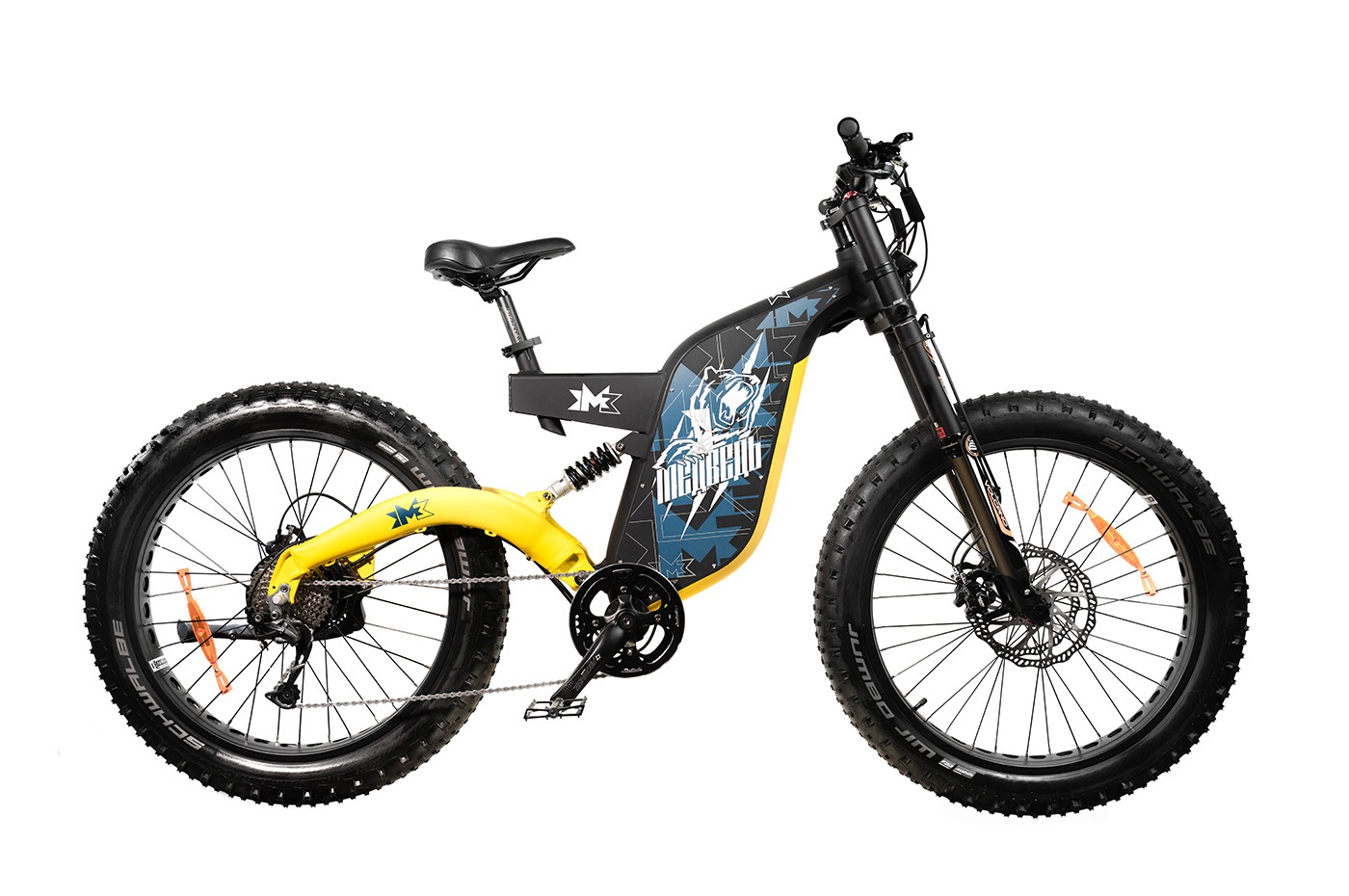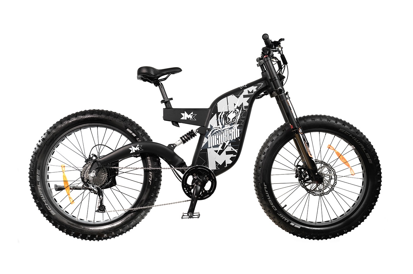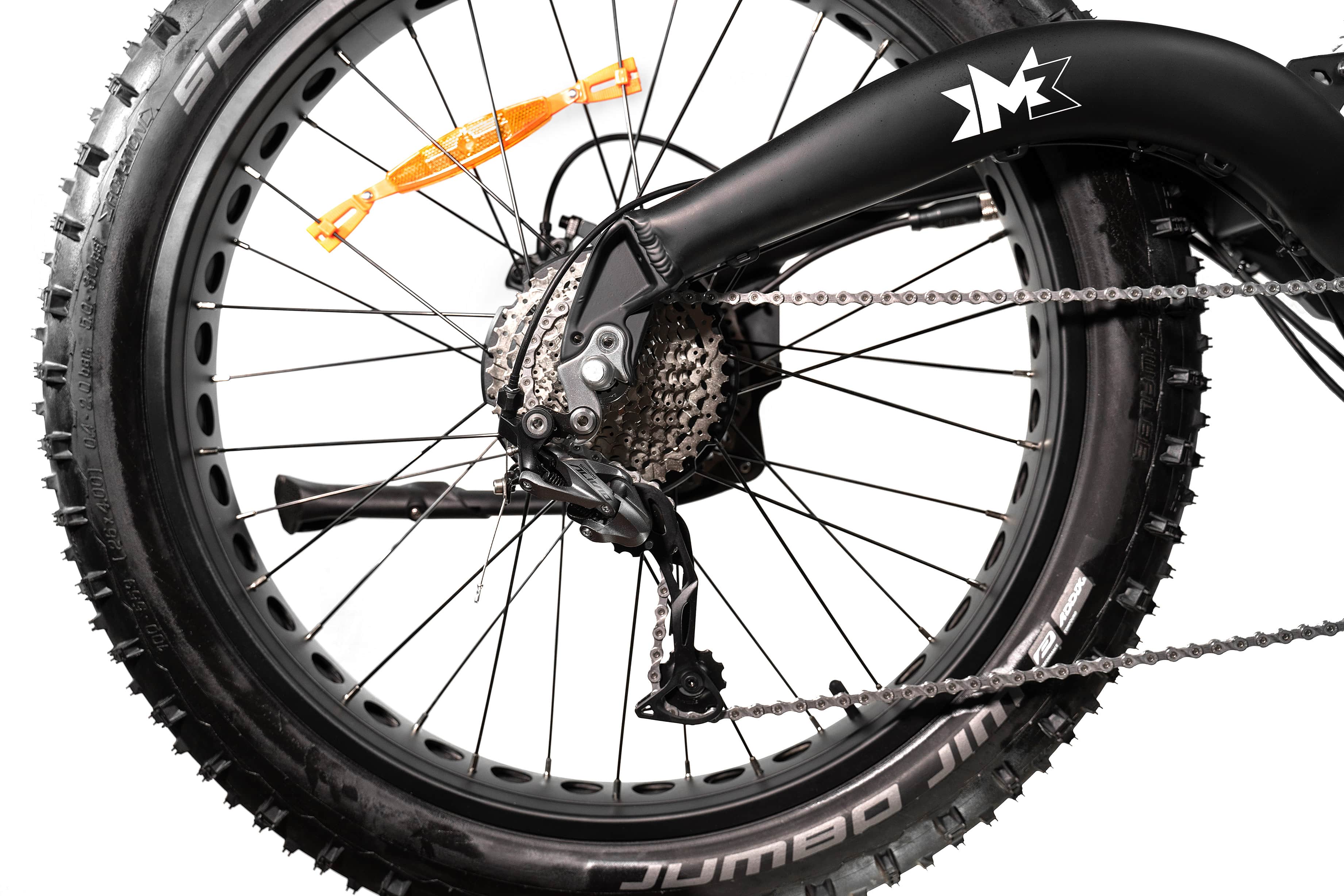 Высококачественные покрышки известного бренда Schwalbe Jumbo Jim размера 26" х 4", благодаря применению нового компаунда, обеспечивают улучшенное сцепление с дорогой и одновременно хороший накат. Надёжная подножка, расположенная сзади, позволит поставить электровелосипед там, где это удобно, не прислоняя его и не опуская на землю.
