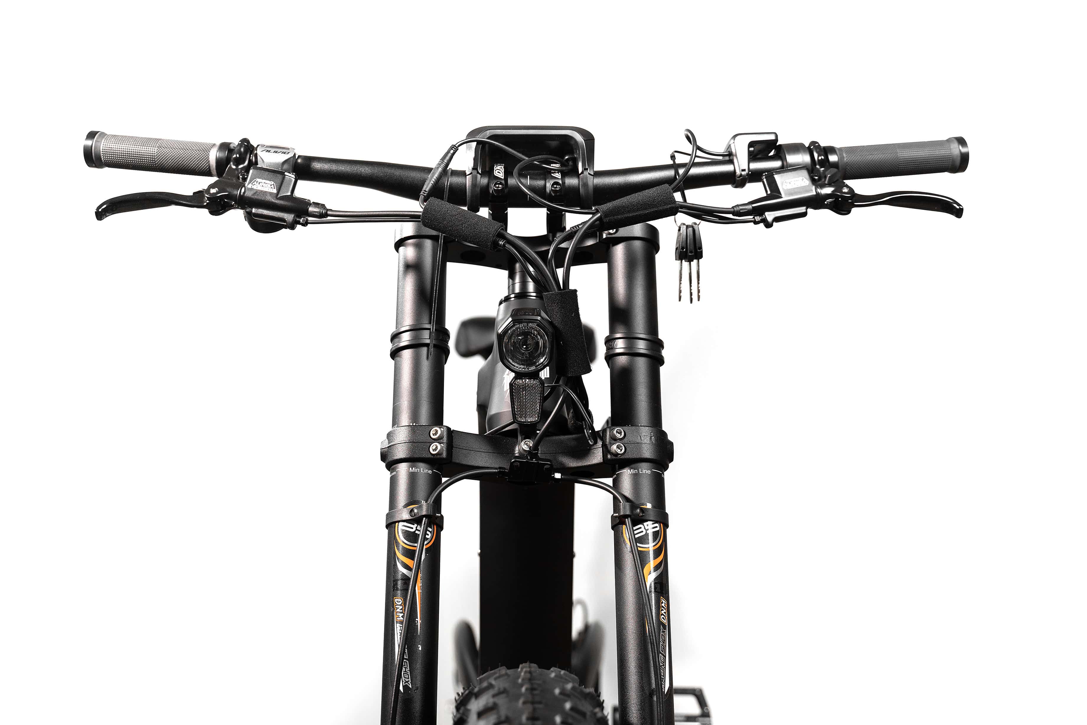 В связи с тем, что электровелосипед на пространственной раме, как правило, немного тяжелее классического варианта, для эффективного торможения необходимы качественные тормоза. В данном случае их, фактически, три - кроме заднего тормоза, ротор которого установлен на двигателе, есть ещё двойной передний тормоз с двумя большими роторами, установленными на втулке. Все три тормоза гидравлические, что положительным образом сказывается на их эффективности и удобстве управления.