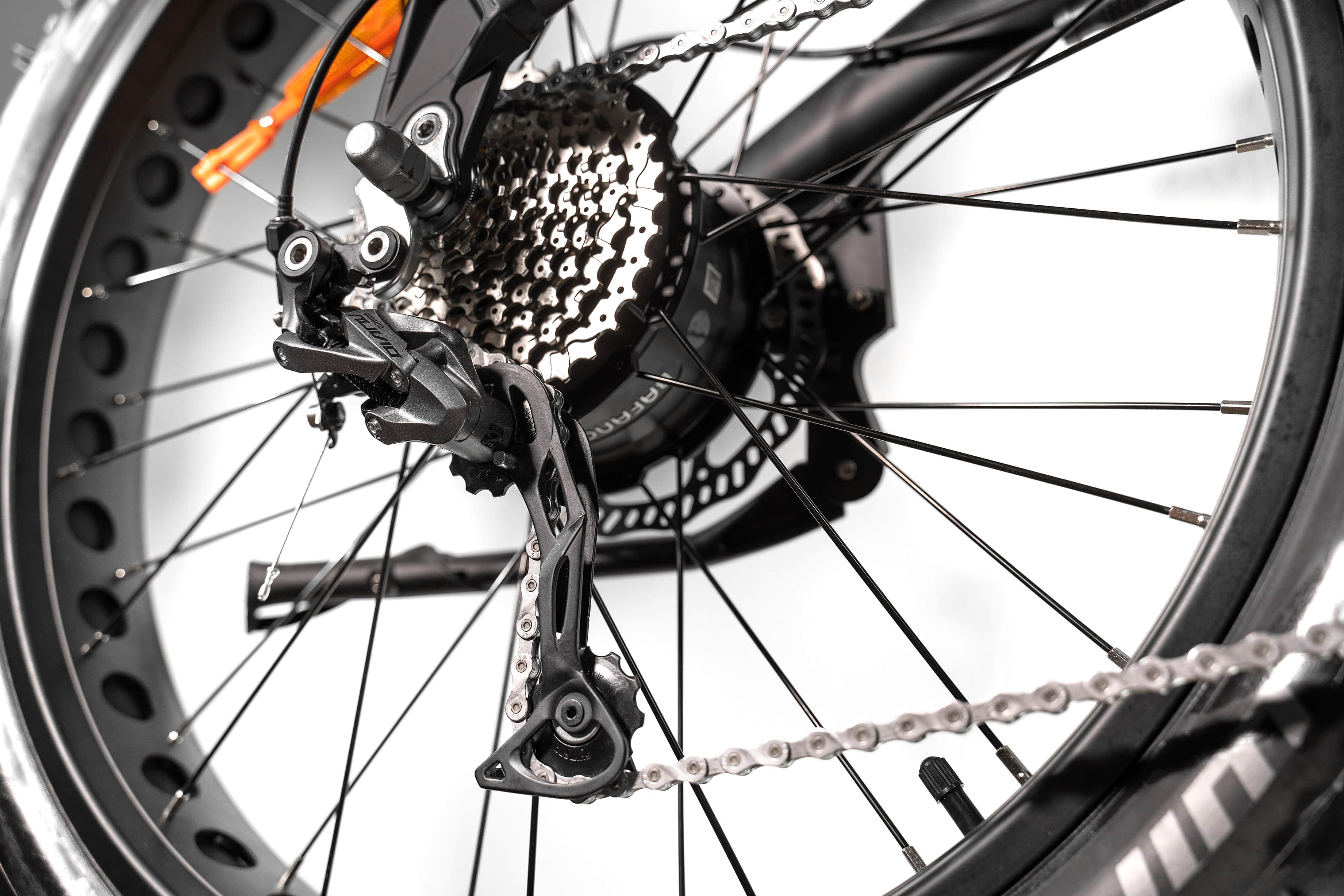 На велосипеде установлен задний переключатель Shimano Tourney на 9 скоростей, которых вполне хватает для комфортного катания. В отличие от центрального мотора, в случае мотор-колеса износ кассеты и цепи значительно ниже, так как вращающий момент передаётся на колесо напрямую, а не через цепь, и даже если цепь порвётся, на велосипеде с мотор-колесом можно продолжить движение.