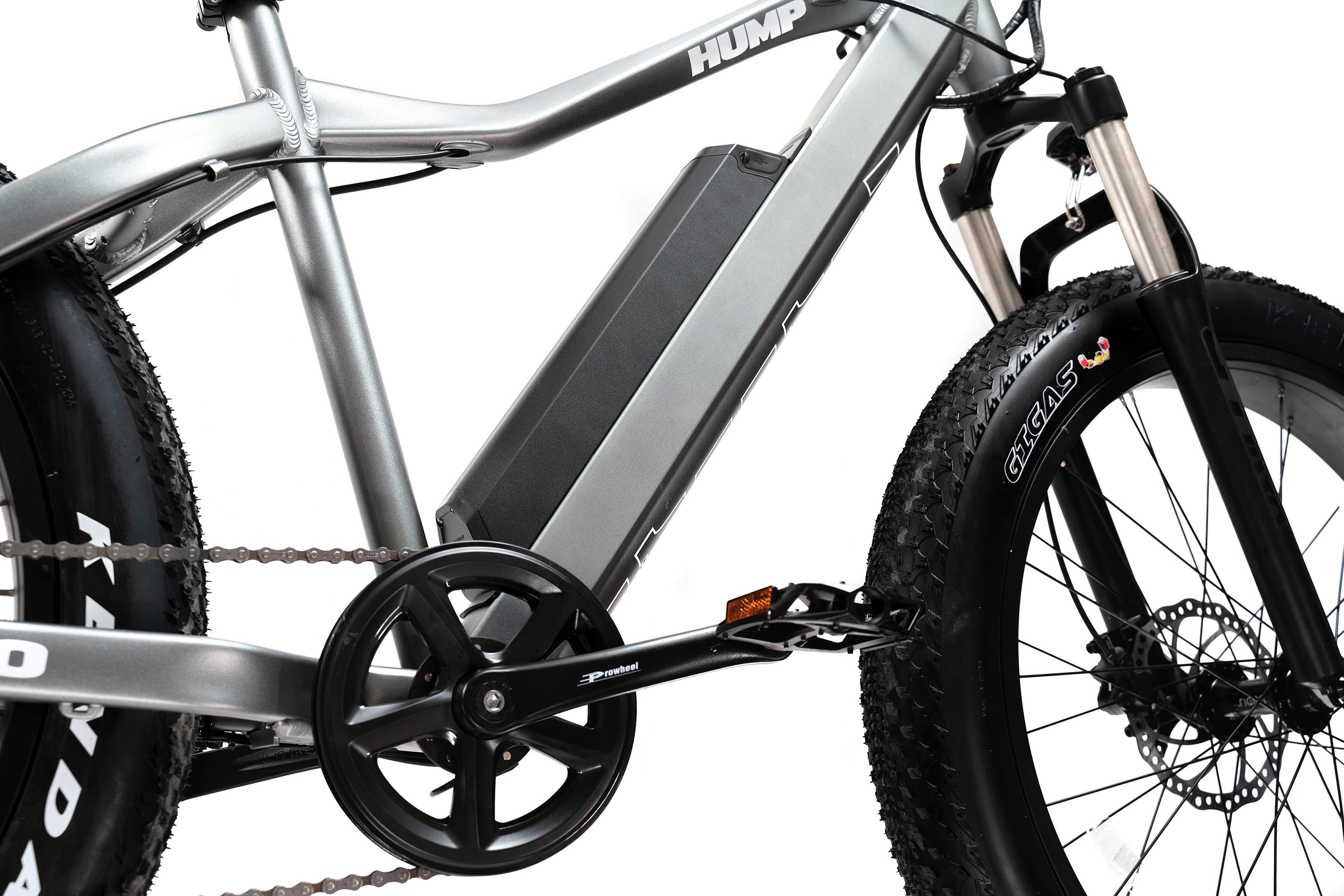 Заднеприводный фэт-байк Медведь Hump 1000 собран на прочной алюминиевой раме, способной выдержать нагрузку до 150 кг. Он оснащён пружинно-масляной амортизационной вилкой, гидравлическими дисковыми тормозами и 7-скоростной трансмиссией базового уровня Shimano Altus.
