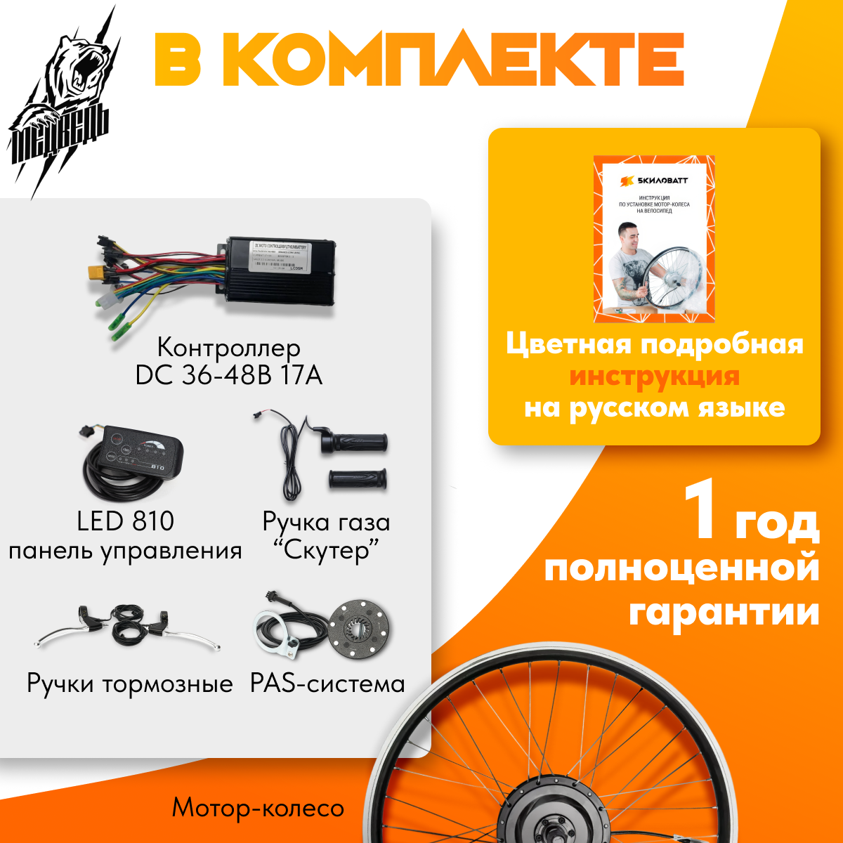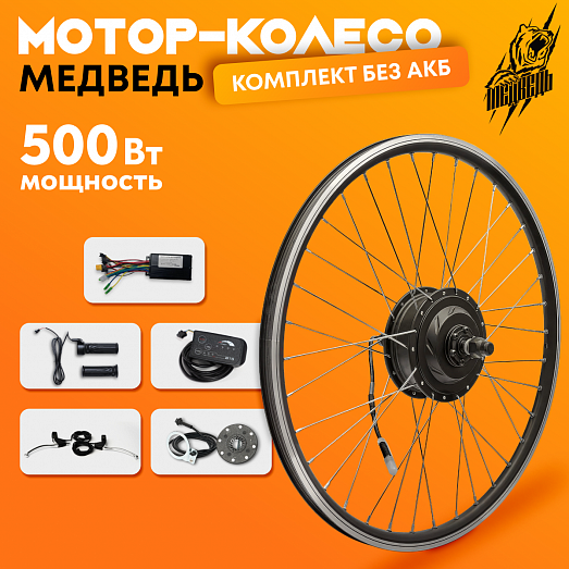 Мотор-колесо мощностью 500 Вт устанавливается на место переднего колеса. Корпус двигателя изготовлен из алюминия, на нём имеется 6 отверстий для крепления тормозного диска. Герметичный разъём на кабеле обеспечивает качественное соединение с контроллером, а также защиту контактов от влаги и коррозии. На выходе из оси двигателя кабель защищён стальной пружиной и резиновым колпачком.