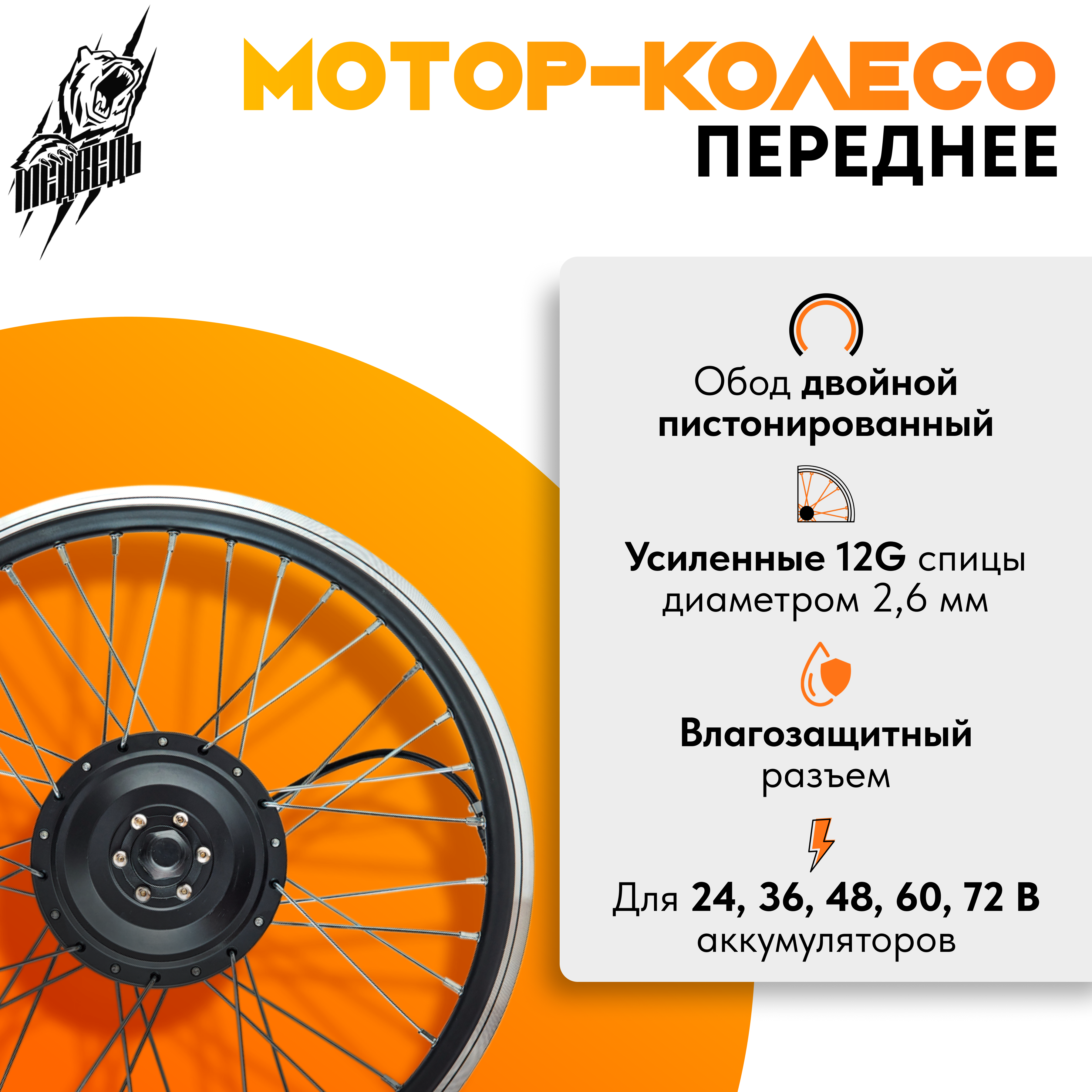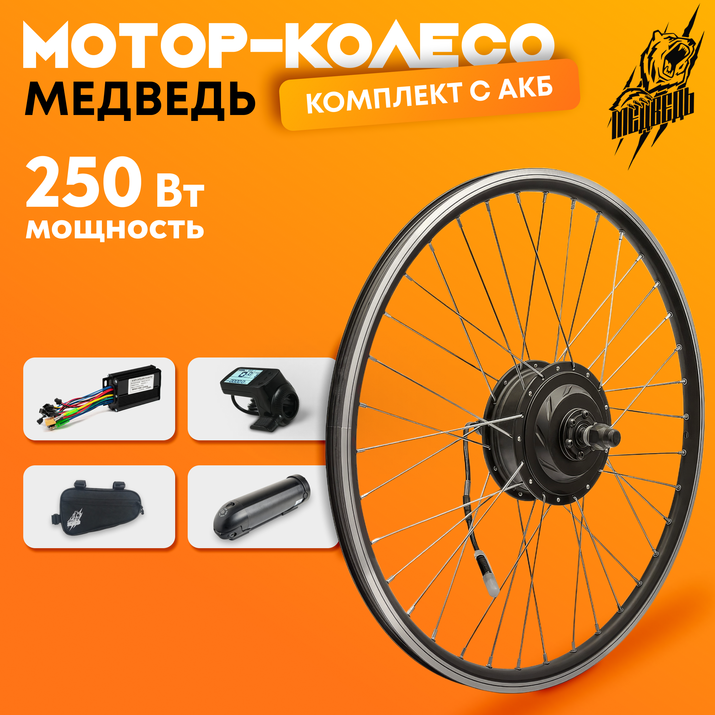 - Заспицованное мотор-колесо мощностью 250W с двойным усиленным ободом из алюминиевого сплава указанного Вами диаметра, от 20 до 29 дюймов;