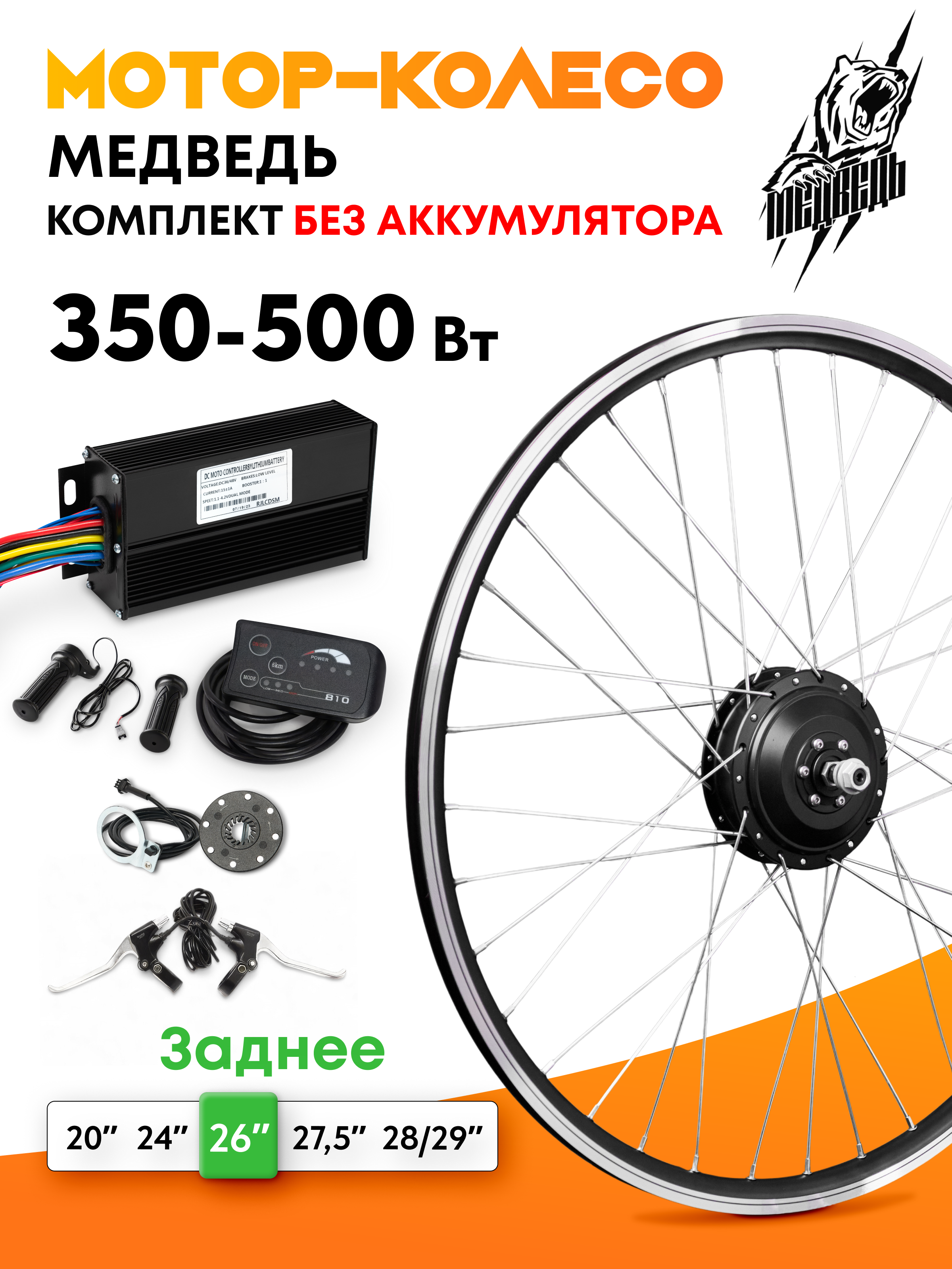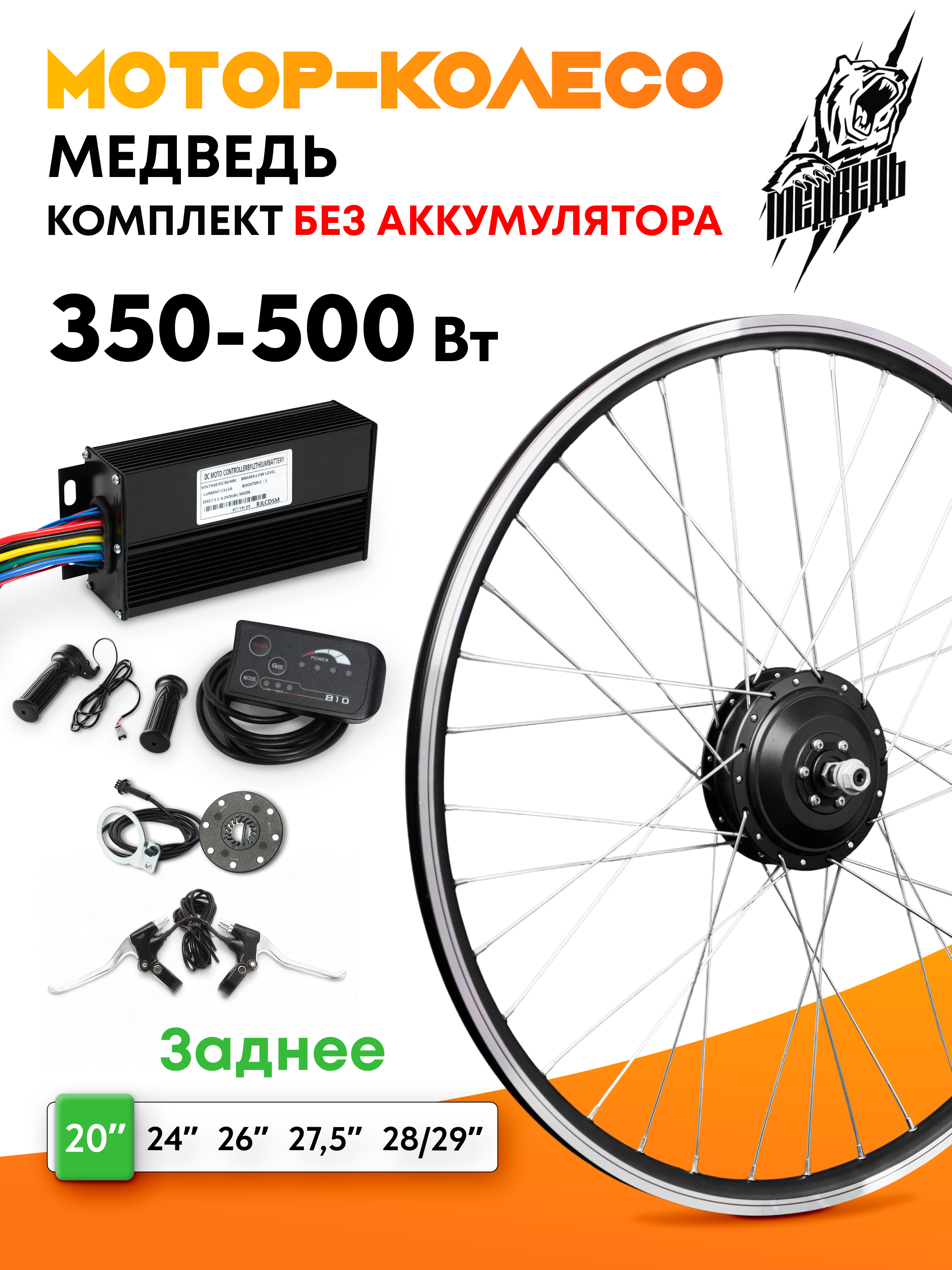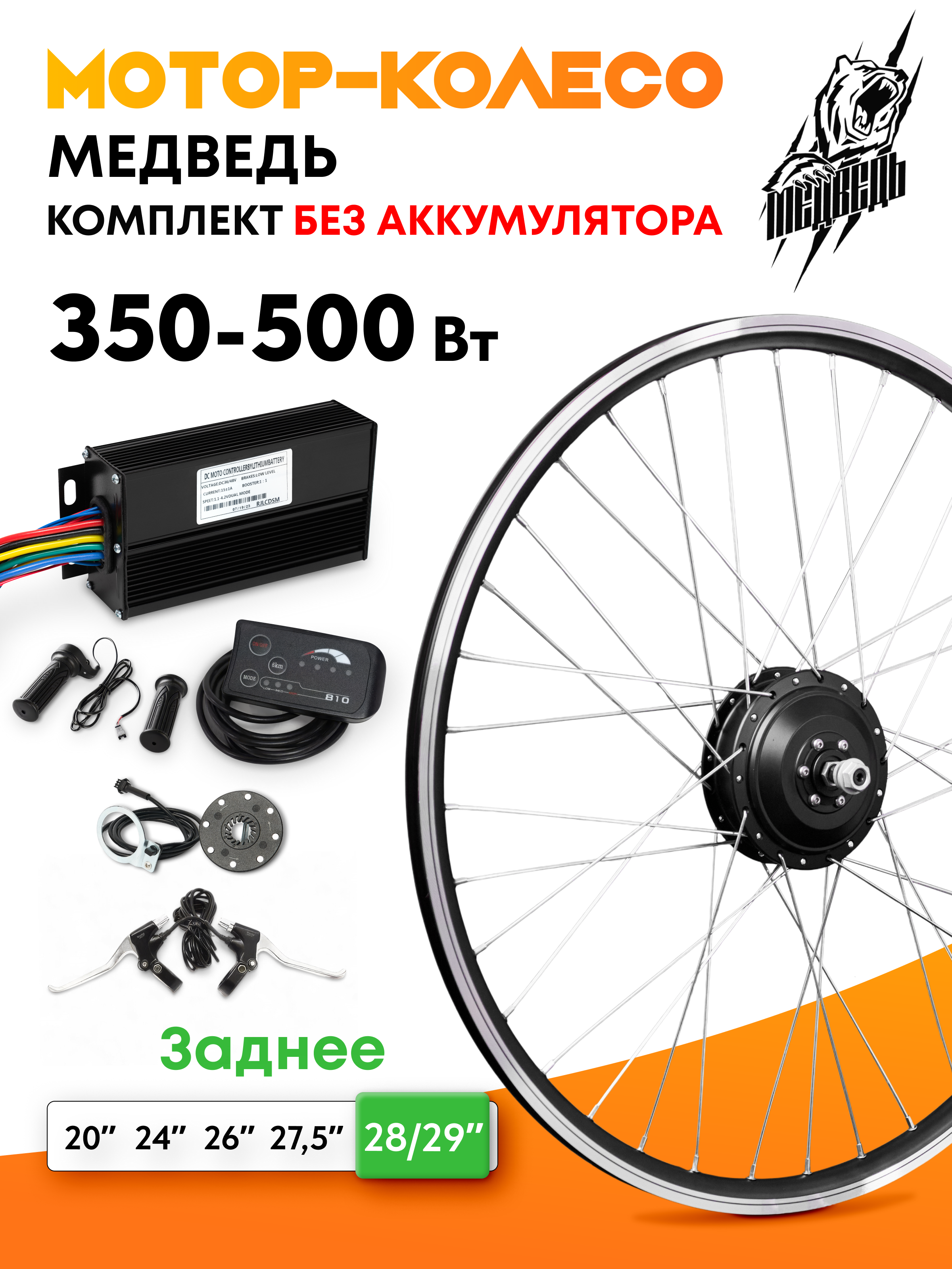 - Заспицованное мотор-колесо мощностью 350Вт с двойным усиленным ободом из алюминиевого сплава указанного Вами диаметра, от 20 до 29 дюймов;