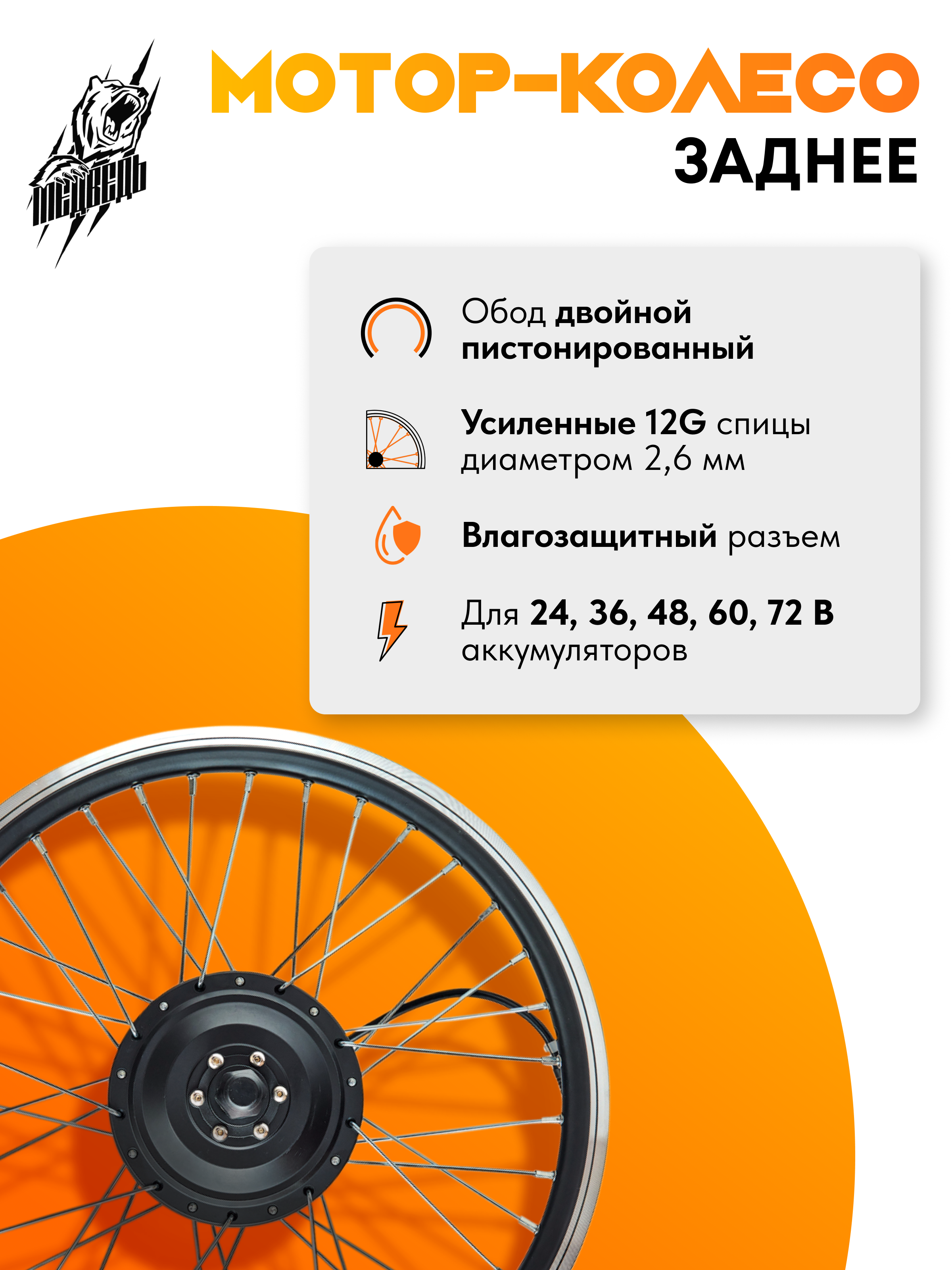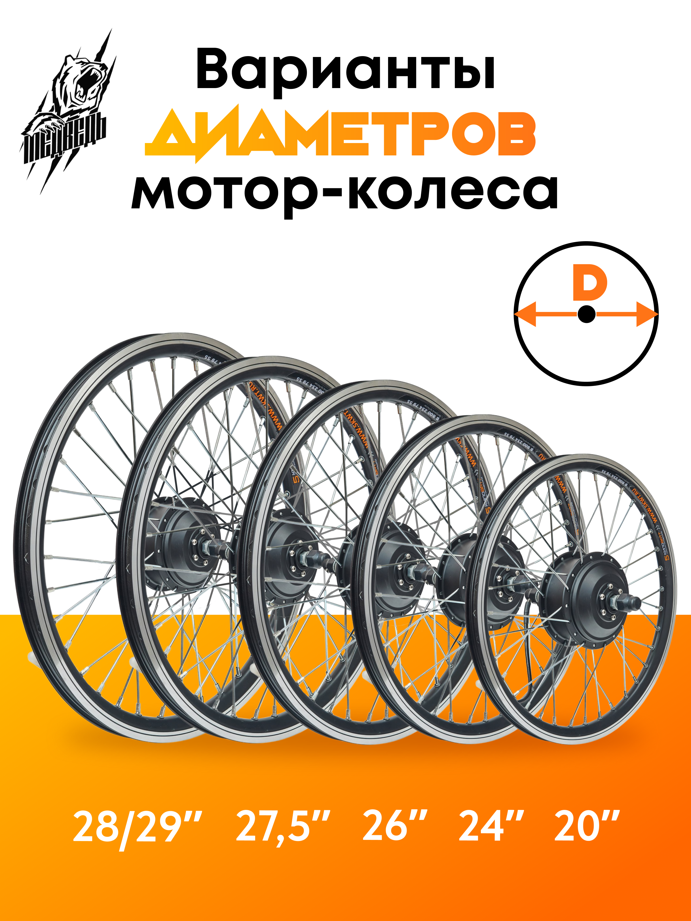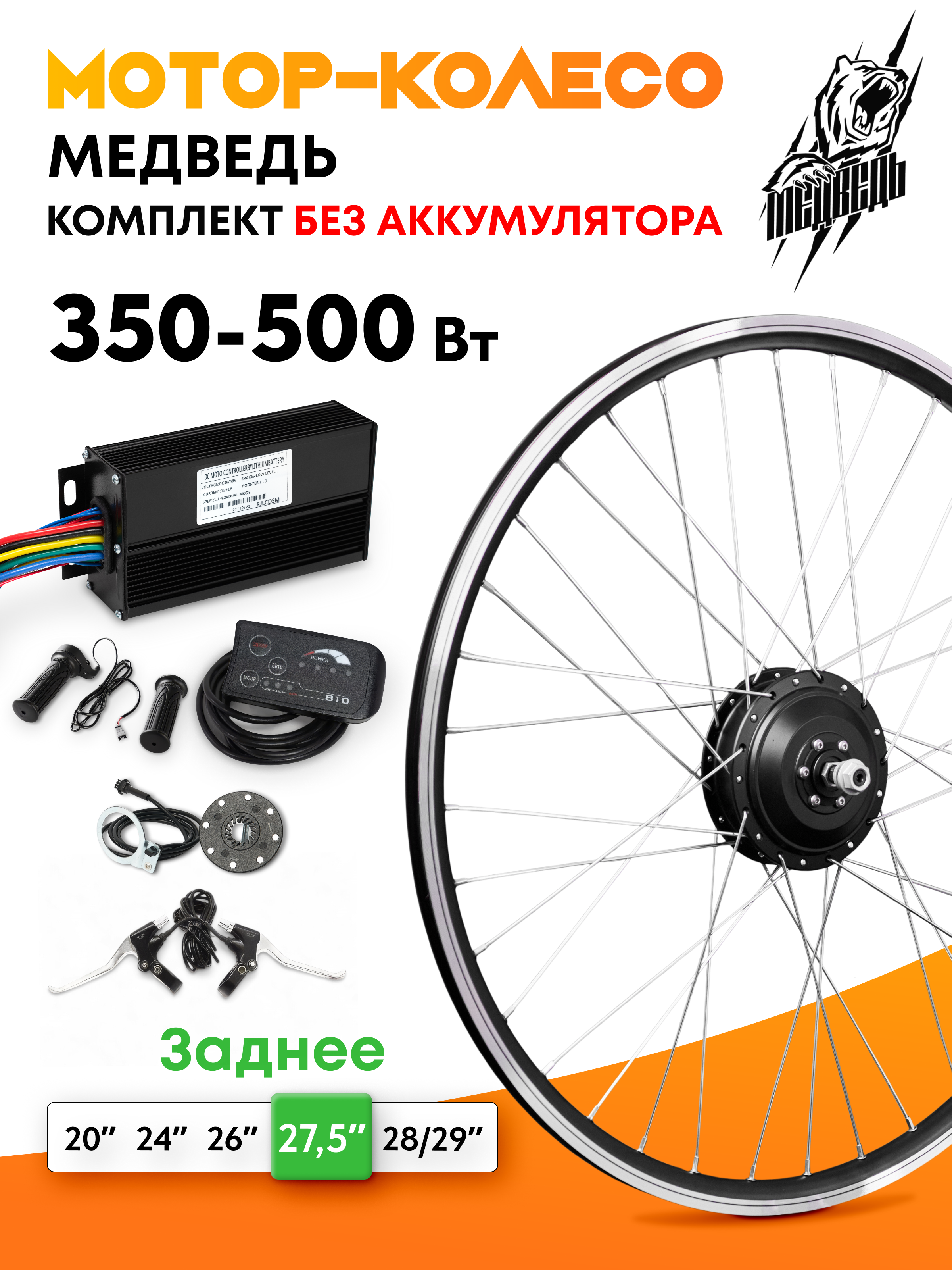 - Заспицованное мотор-колесо мощностью 350Вт с двойным усиленным ободом из алюминиевого сплава указанного Вами диаметра, от 20 до 29 дюймов;