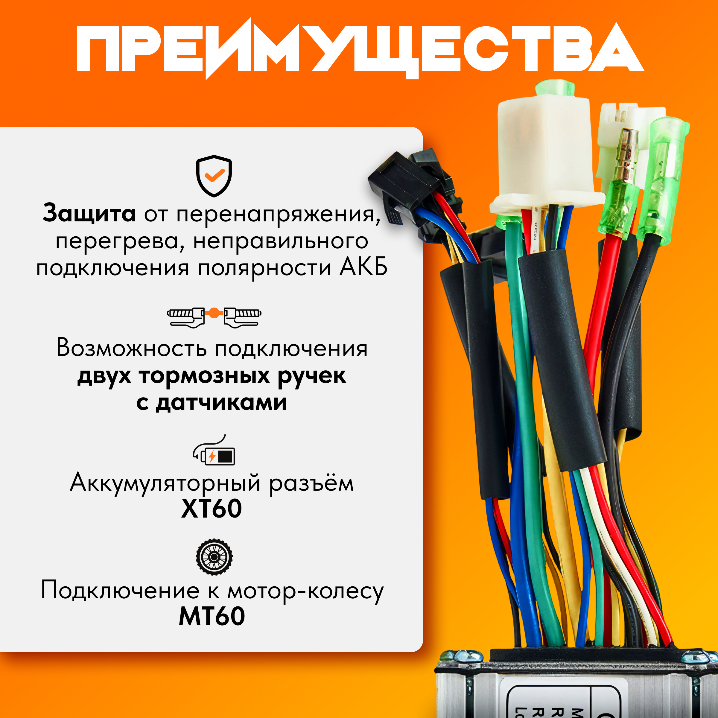- Защита от перенапряжения, перегрева, неправильного подключения полярности АКБ.