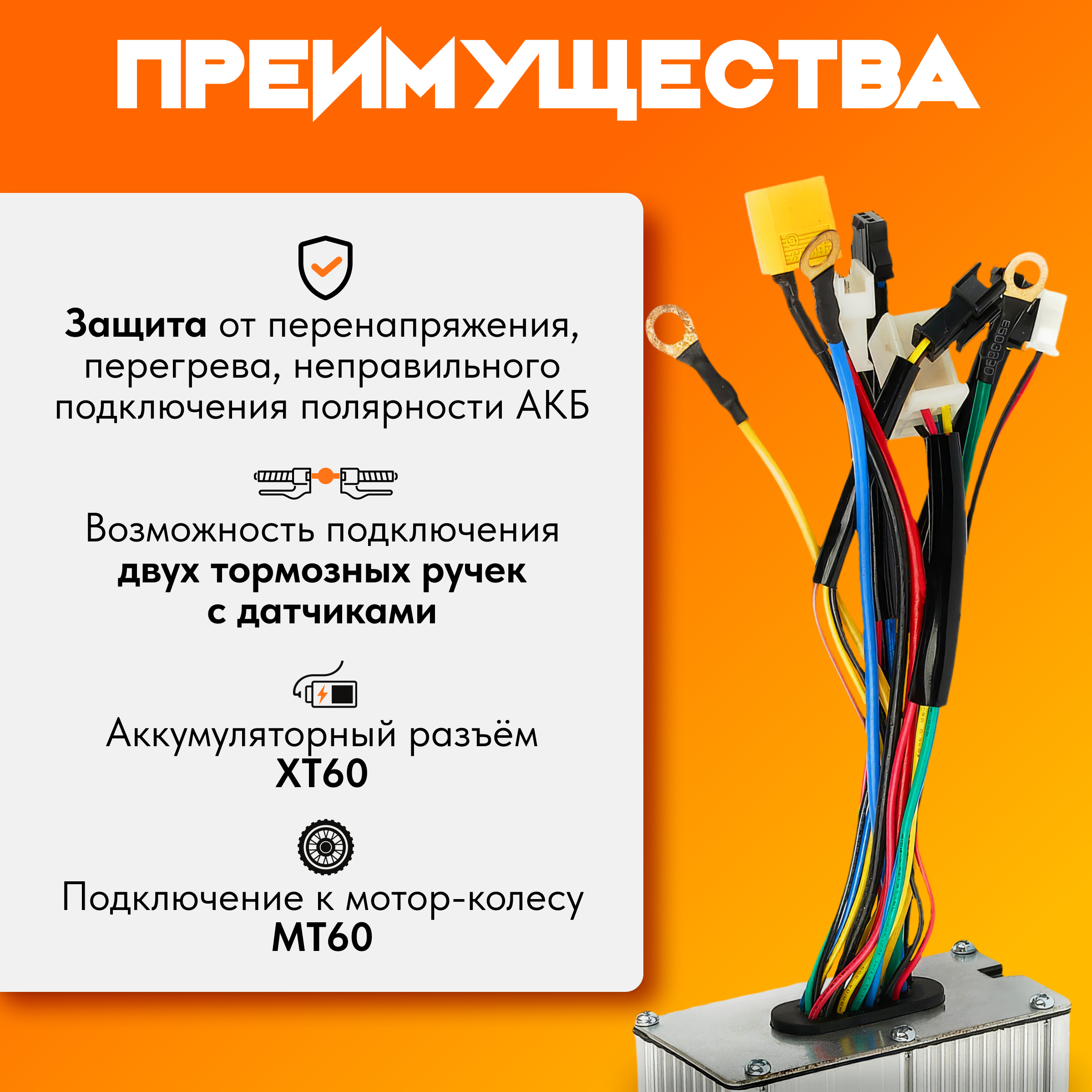 - Защита от перенапряжения, перегрева, неправильного подключения полярности АКБ.