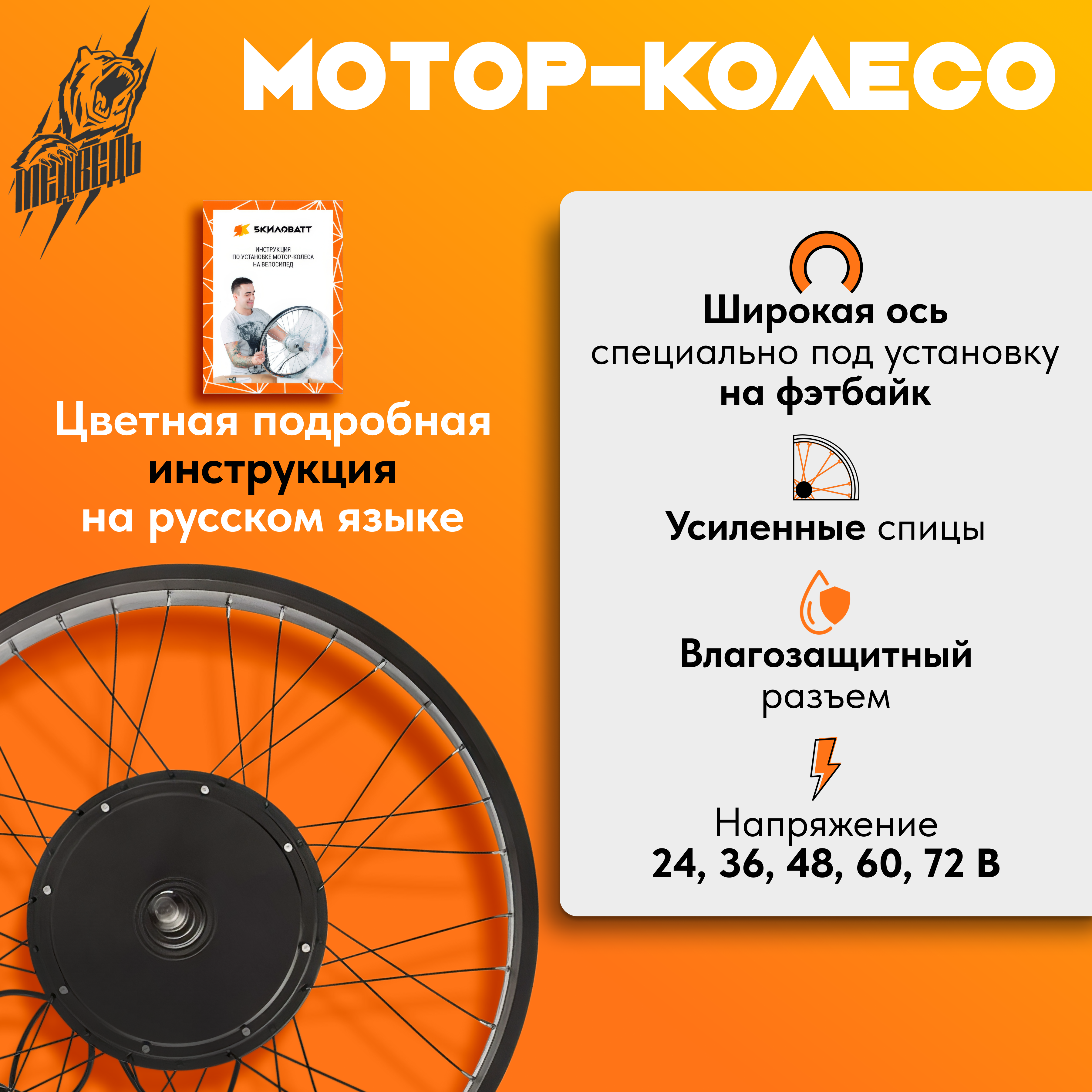 Мотор-колесо рассчитано на работу с напряжениями 48 В, 60 В и 72 В, и способно обеспечить уверенный разгон и длительное движение со скоростью 65 км/ч. Для управления двигателем необходим контроллер на 40 А. Если вы собираете электровелосипед самостоятельно, рекомендуем позаботиться об установки надёжных торкармов (усилителей дропаутов), чтобы ось двигателя не провернуло в раме при высоких нагрузках.