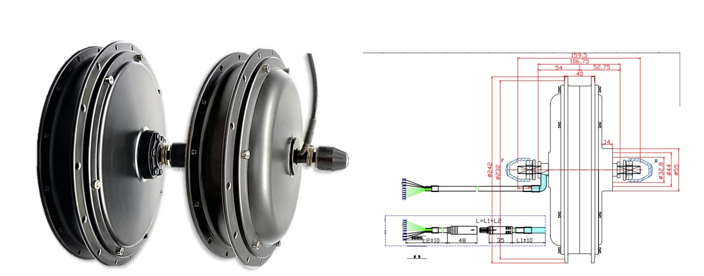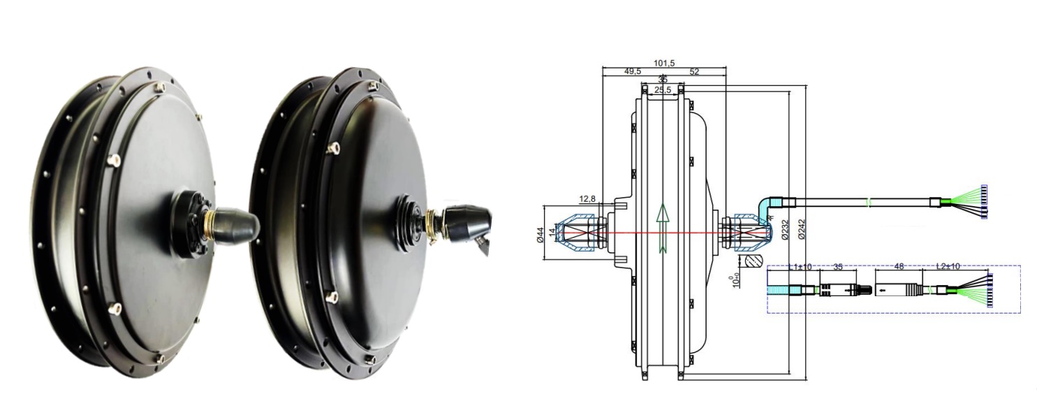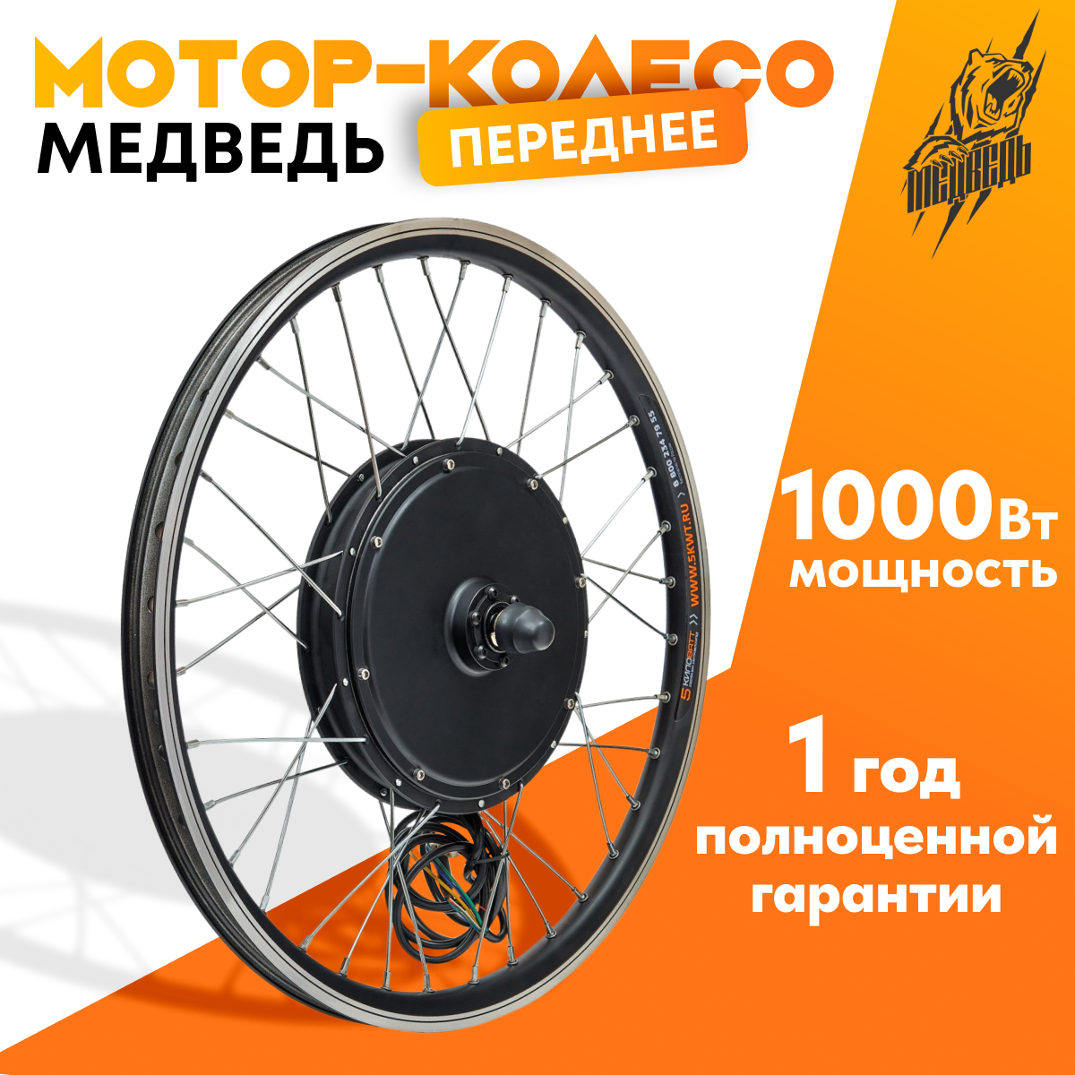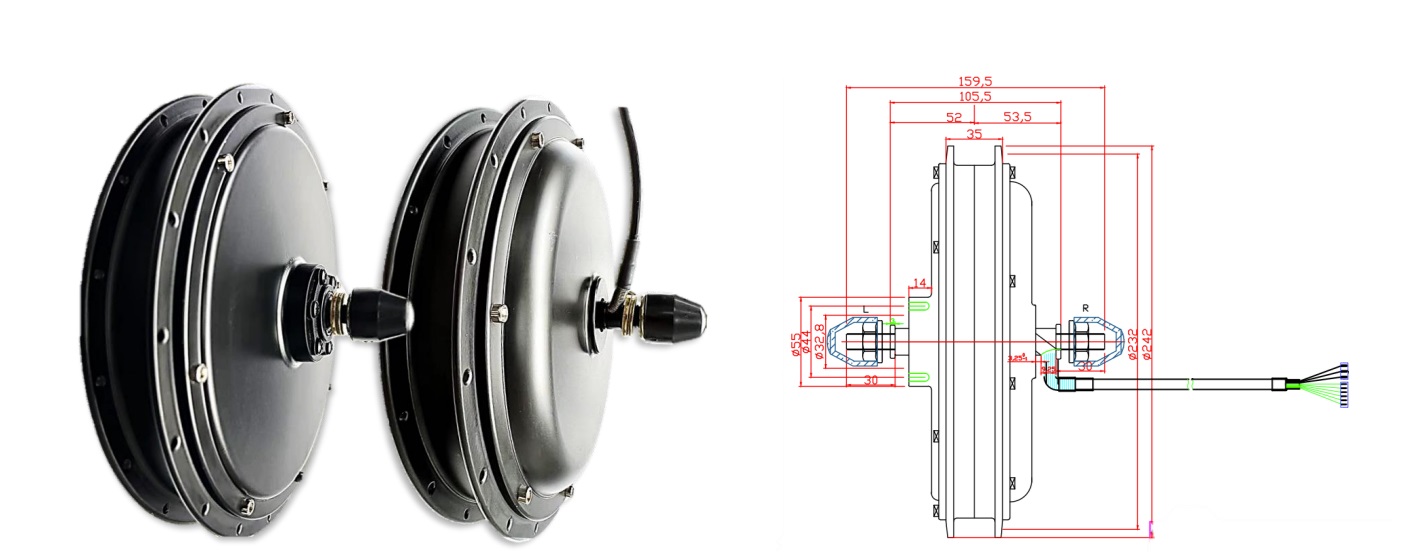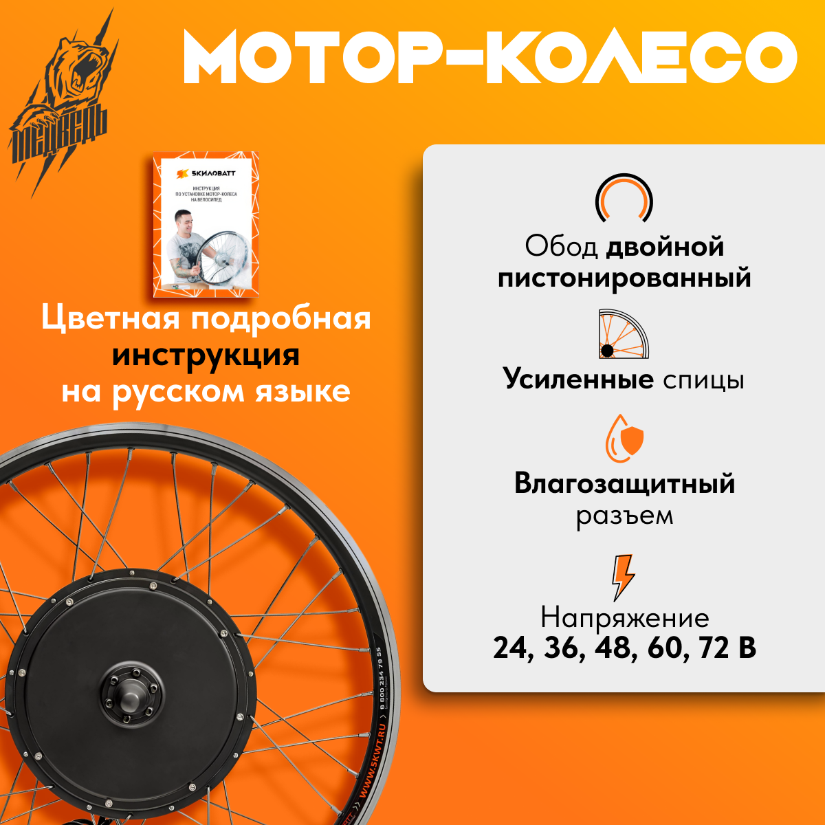 На данном мотор-колесе используется двойной обод, который рассчитан на повышенные нагрузки, что особенно актуально для электровелосипедов, так как вместо втулки у них стоит электромотор. Двигатель заспицован в обод с использованием специальных усиленных спиц, которые также рассчитаны на высокие нагрузки и не порвутся при эксплуатации. В наличии имеются мотор-колёса всех стандартных размеров (20", 24", 26", 27,5", 28-29").