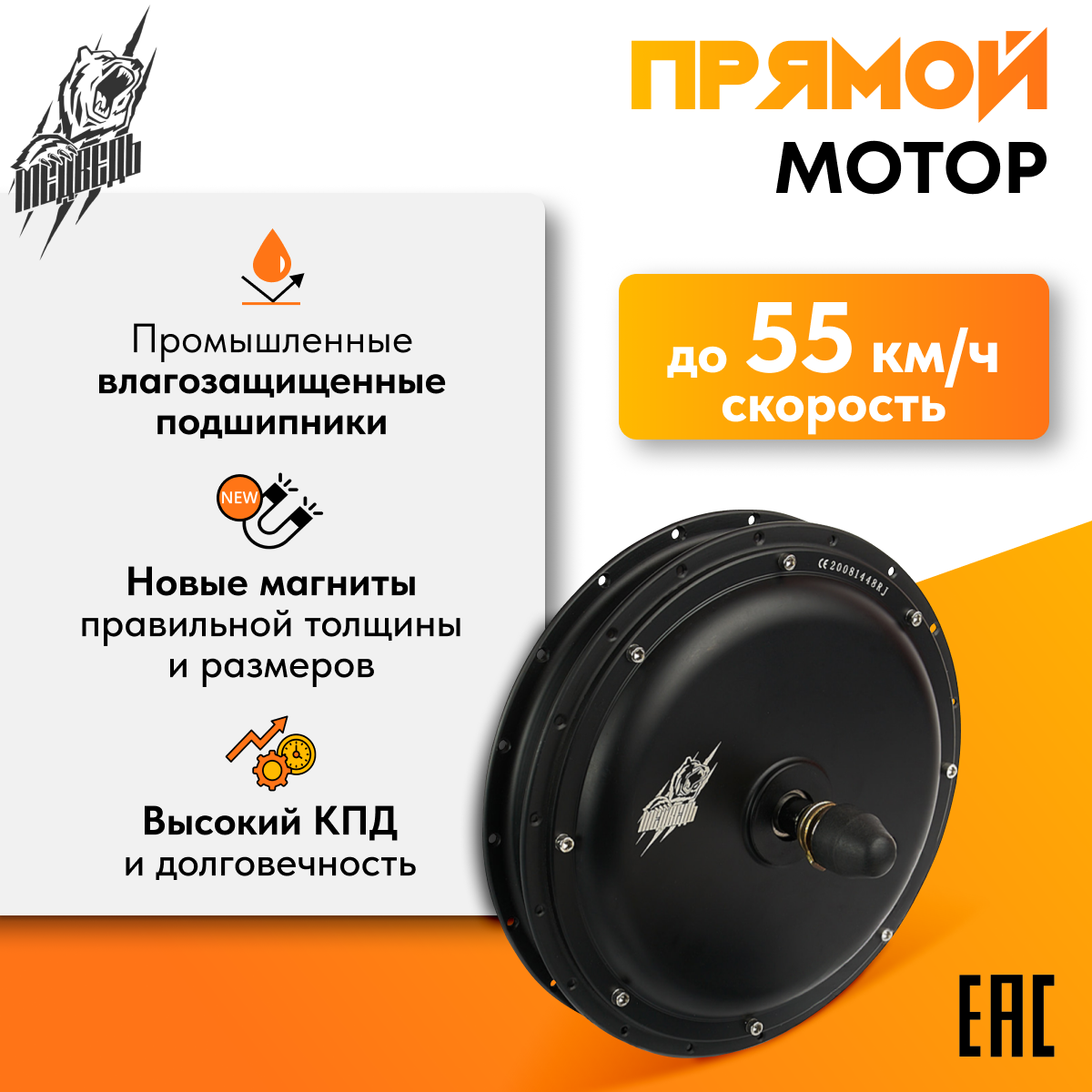 Двигатели мощностью 1000 Вт уже можно отнести к категории "выше среднего". Такой вариант отлично подойдёт тем, кто уже имеет опыт эксплуатации маломощных электровелосипедов, и хочет хочет получить более высокую скорость и ускорение. Данное мотор-колесо рассчитано на работу с напряжениями 24 В, 36 В и 48 В, и позволяет разгоняться уже до 55 км/ч. Для управления двигателем не забудьте приобрести контроллер на 25 А.