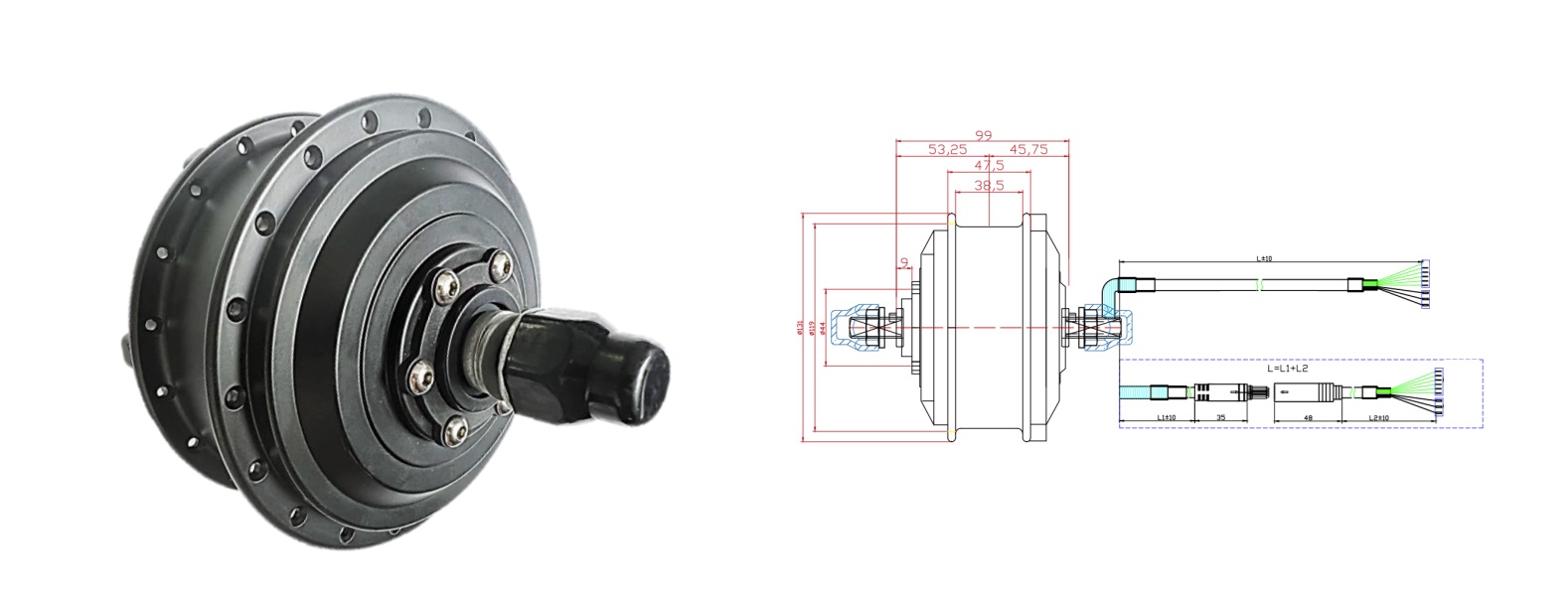 Данное мотор-колесо являются редукторным — внутри установлен редуктор, который повышает крутящий момент. В редуктор этого мотор-колеса установлена обгонная муфта, что полностью исключает сопротивление накату, и тем самым абсолютно не создает сопротивления при движении на педалях.