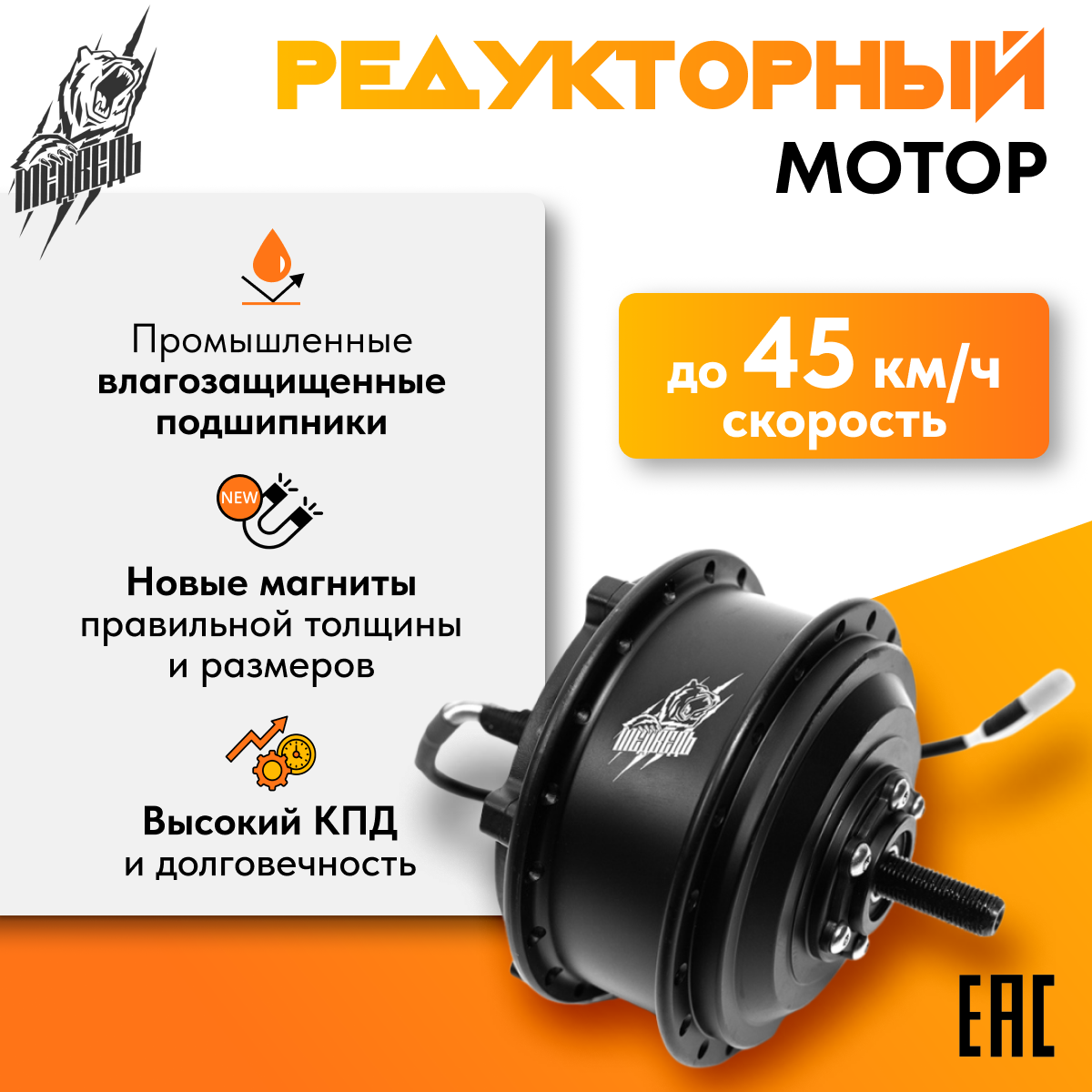 Если для вас мощности 250-350 Вт недостаточно, и хочется что-то более динамичное, отличным вариантом будет редукторное мотор-колесо Медведь заднее на 500-750 Вт. Оно обладает значительно более высоким крутящим моментом и предназначено для установки на заднюю ось велосипеда вместо штатного колеса.