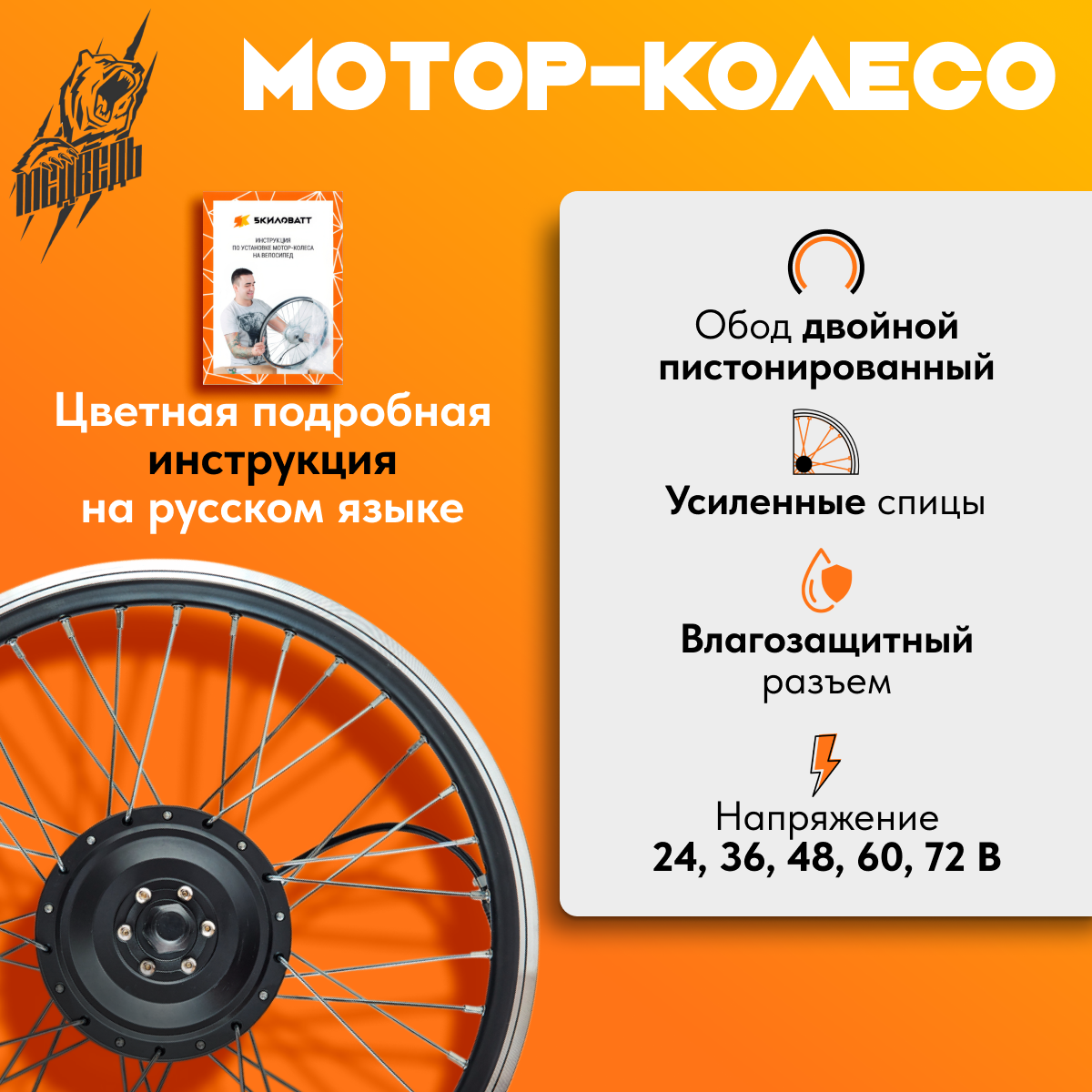 К нашим мотор-колесам в комплекте идет подробная цветная инструкция, на русском языке, и установка не требует специального инструмента и навыков.