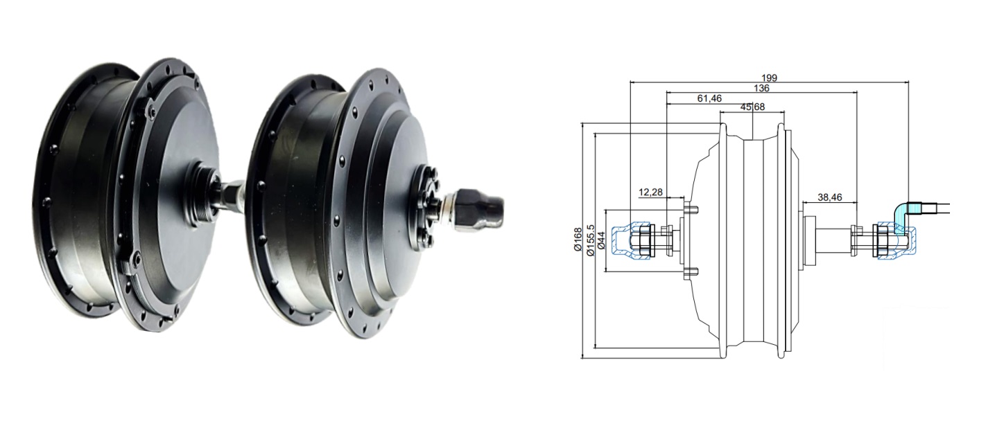 Данное мотор-колесо являются редукторным — внутри установлен усиленный редуктор повышающий крутящий момент. Применение редуктора позволяет значительно снизить вес электродвигателя, и как следствие, сделать велосипед более управляемым. Кроме того, более лёгкий велосипед гораздо удобнее транспортировать и поднимать по лестнице.