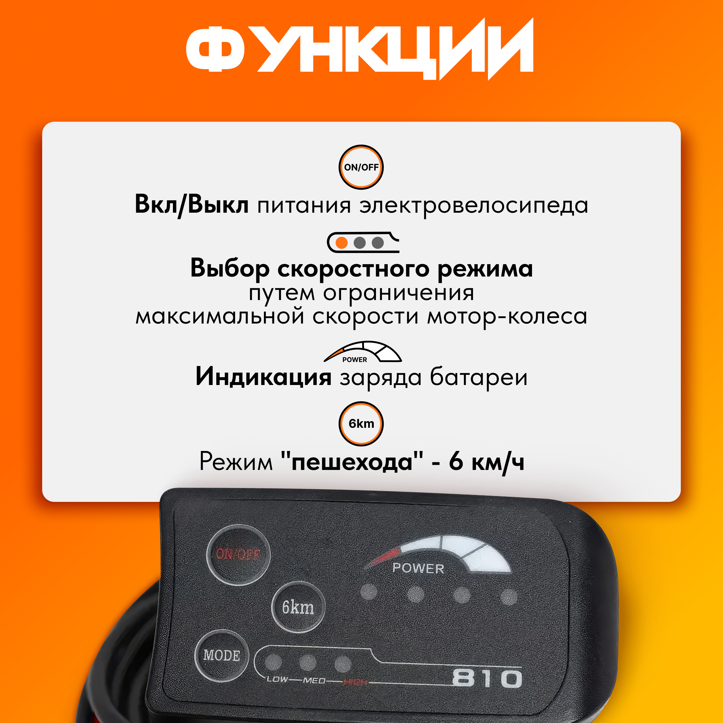 Выбор скоростного режима путем ограничения максимальной подаваемой мощности на мотор-колесо. Варианты: медленно, средняя скорость, максимальная скорость;