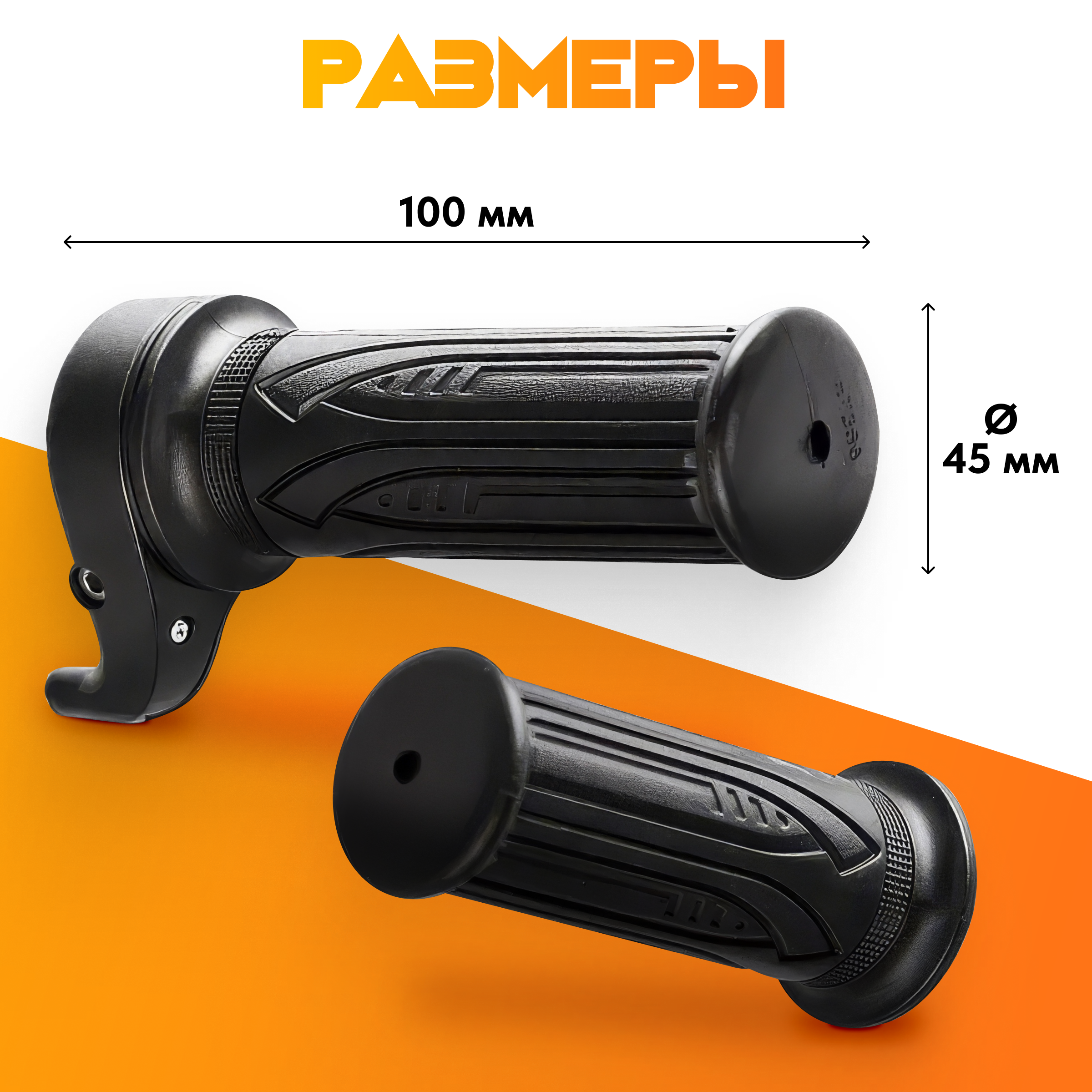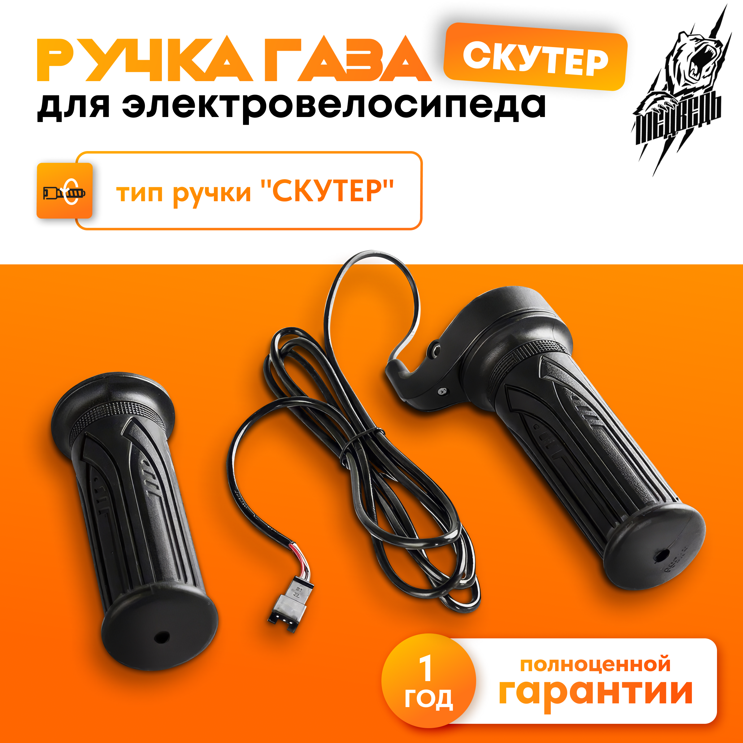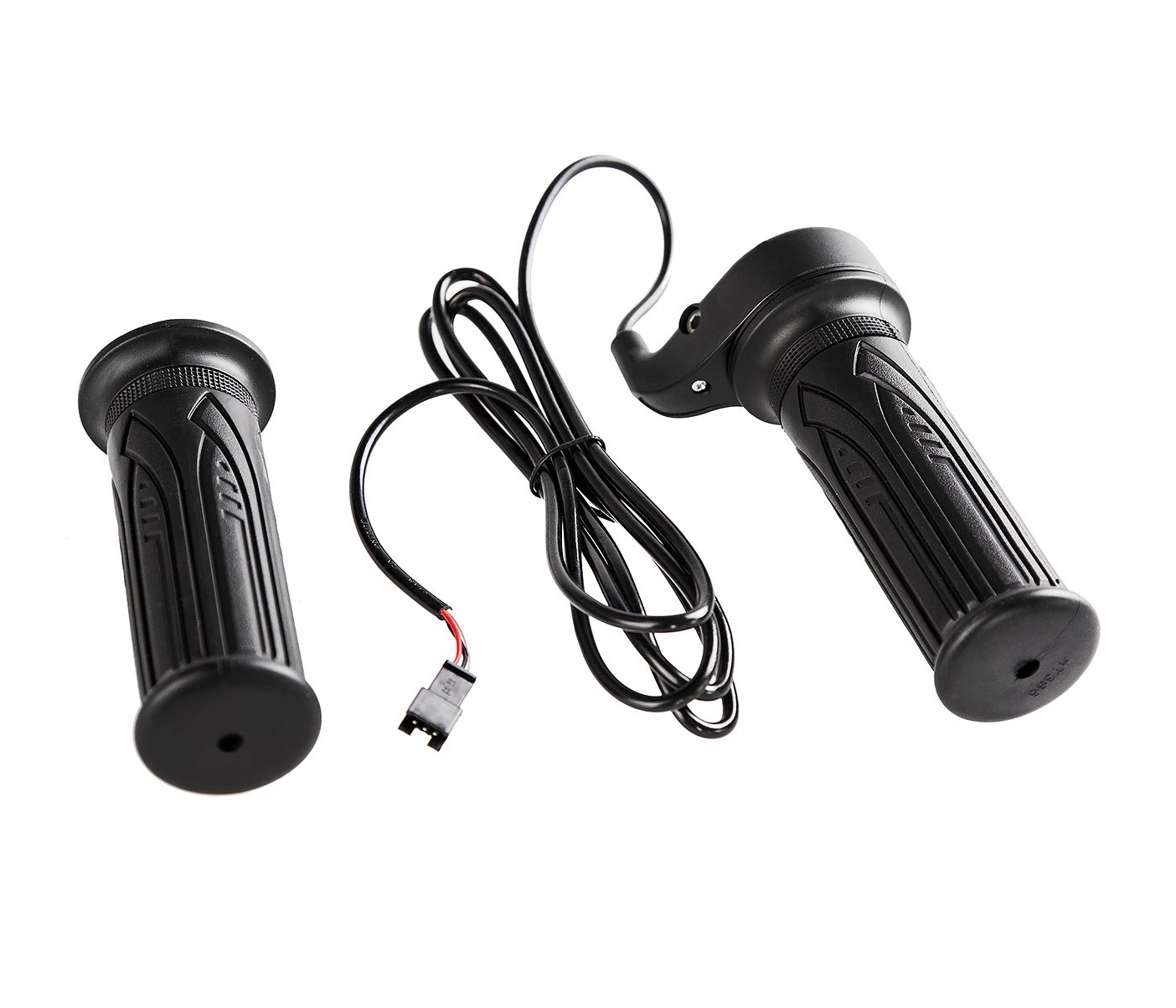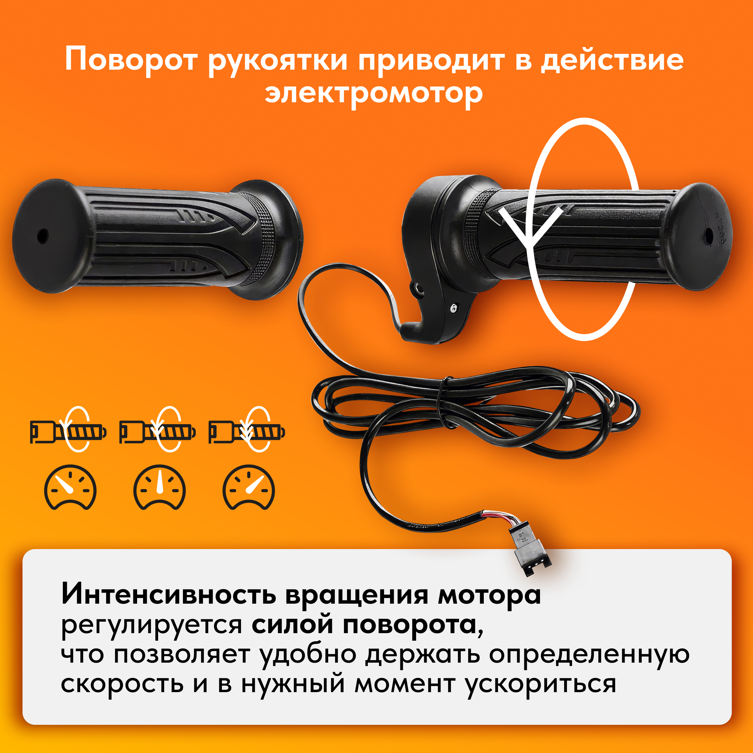 Рукоятка аналогичная мотоциклетным. Принцип работы тот-же. Рукоятка поворачивается по своей оси и приводит в движение электромотор. Скорость контролируется углом поворота ручки.